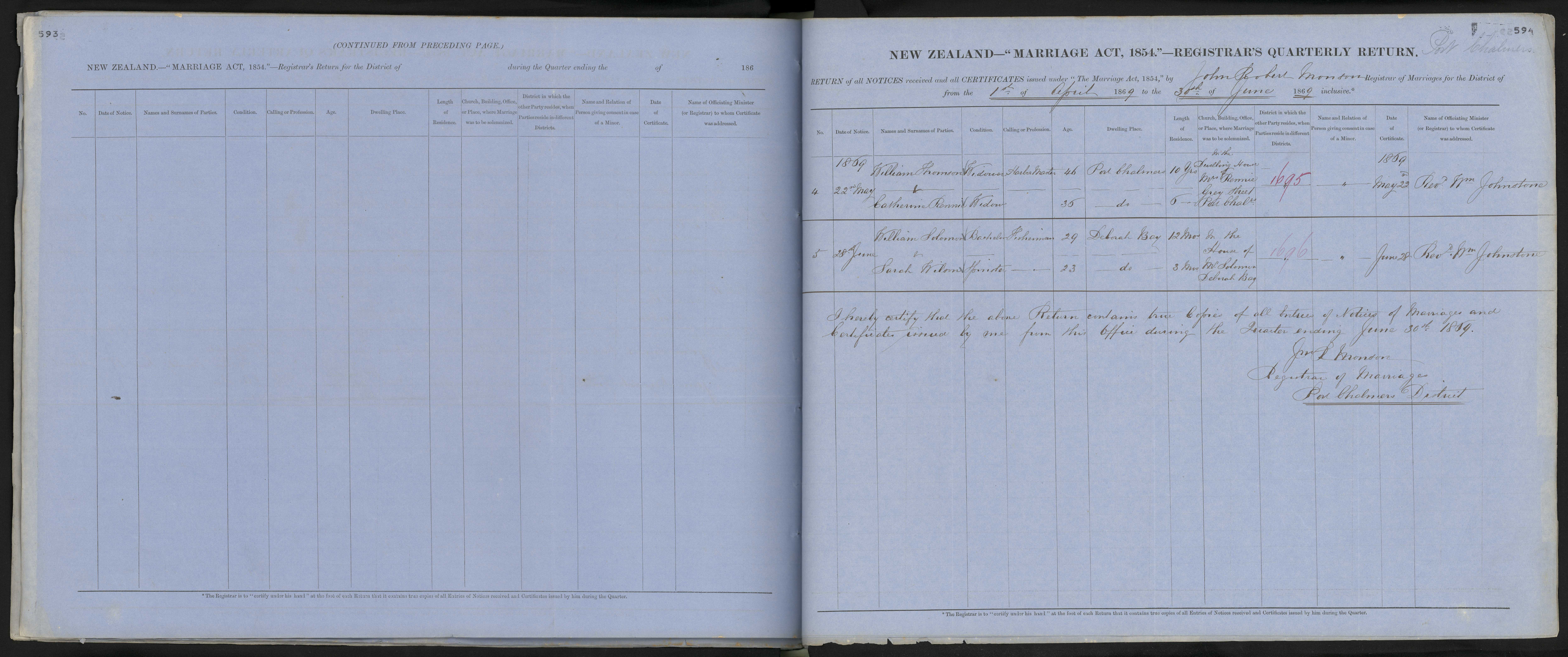 District of Port Chalmers Quarter ending 30 June 1869 Registrar John Robert Monson