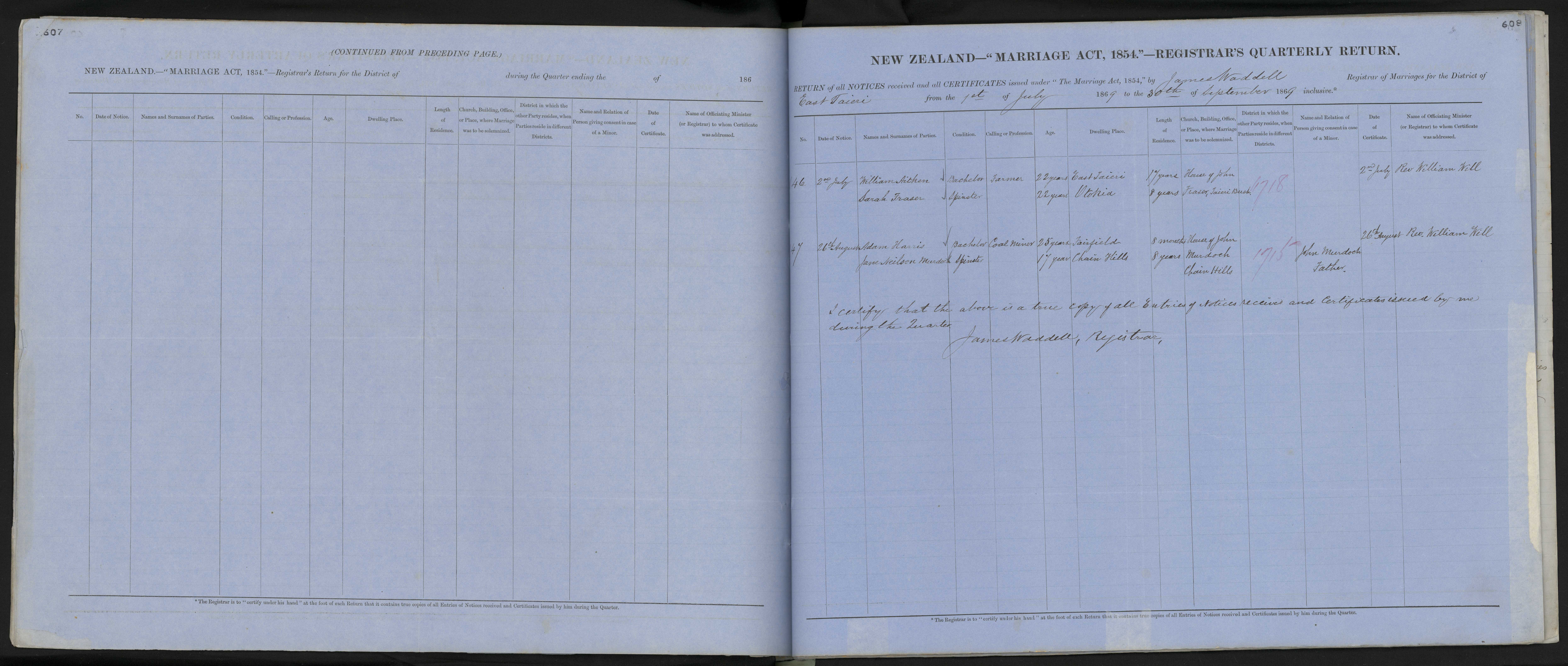 District of East Taieri Quarter ending 30 September 1869 Registrar James Waddell