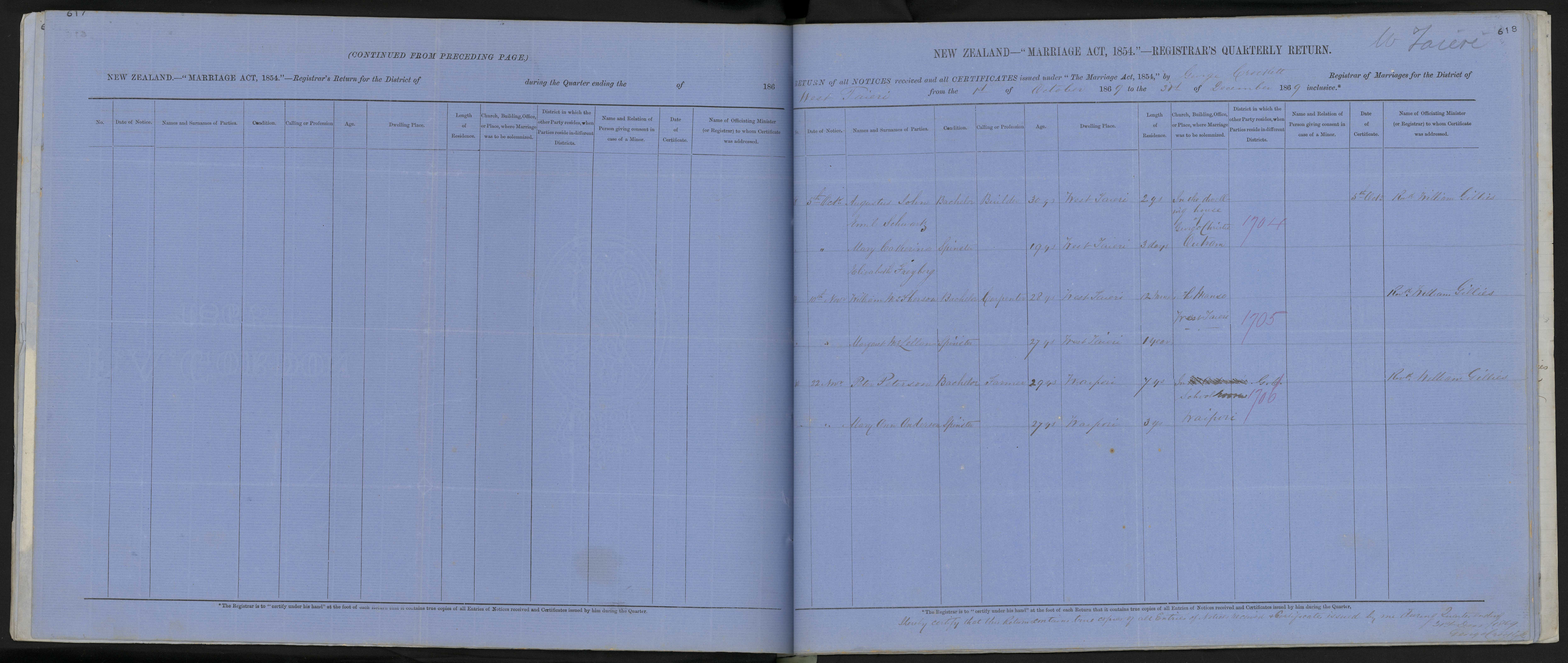 District of West Taieri Quarter ending 31 December 1869 Registrar George Crockett