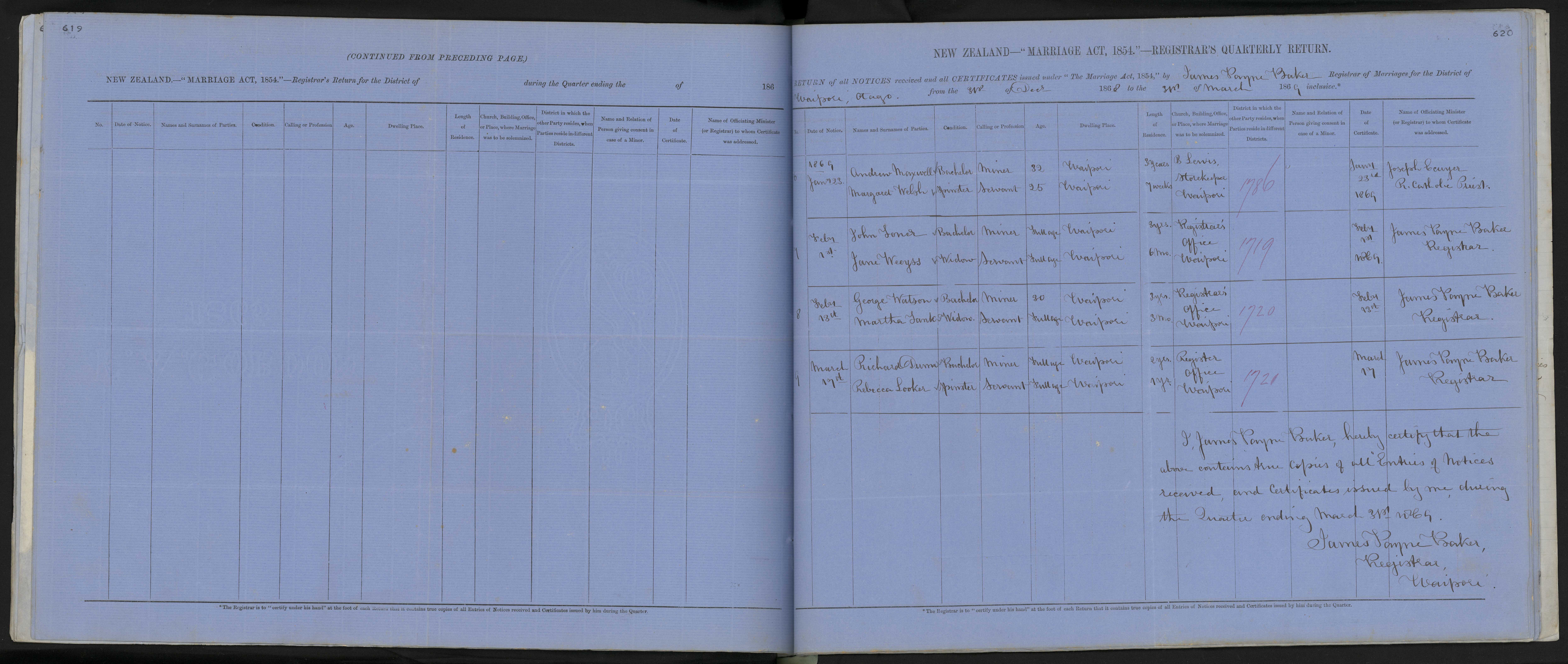 Register Office Waipori 69/1721 17 March 1869 James Payne Baker, Registrar