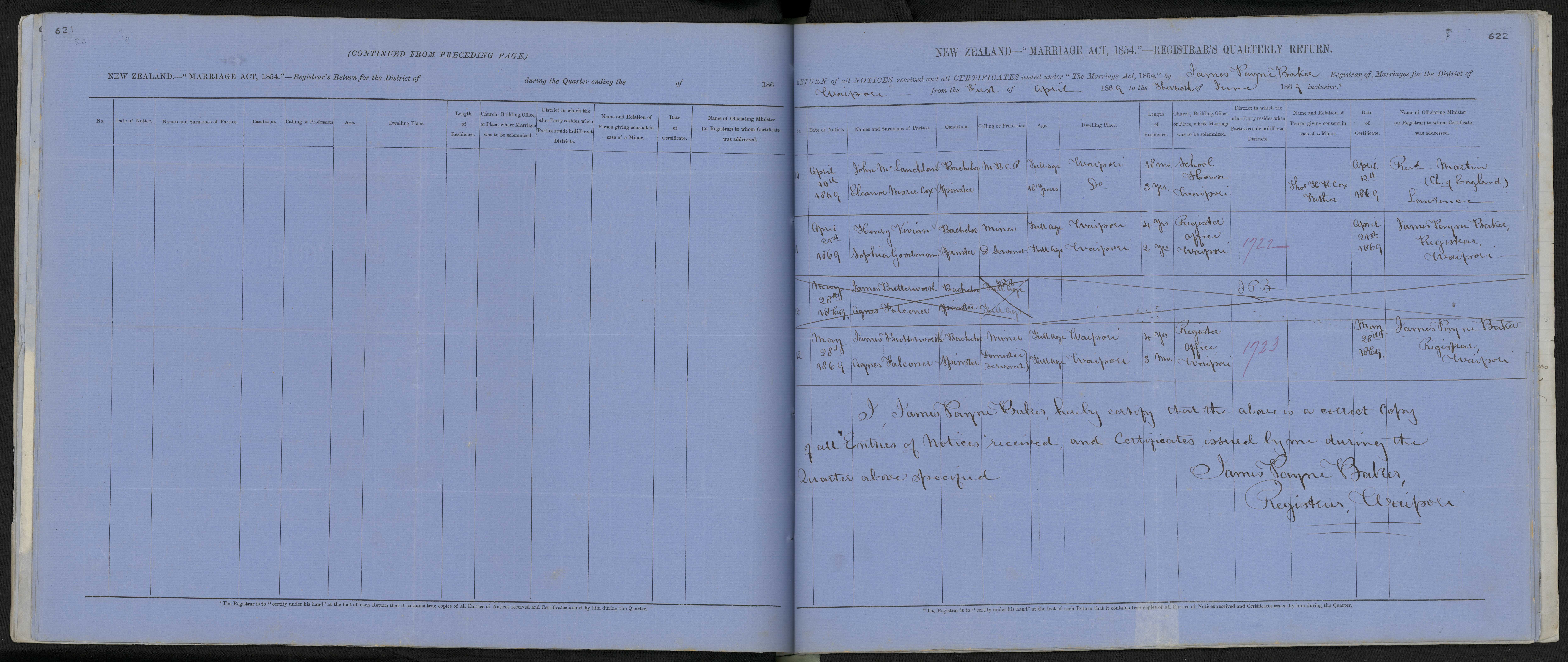Register Office, Waipori 69/1722 21 April 1869 James Payne Baker, Registrar, Waipori