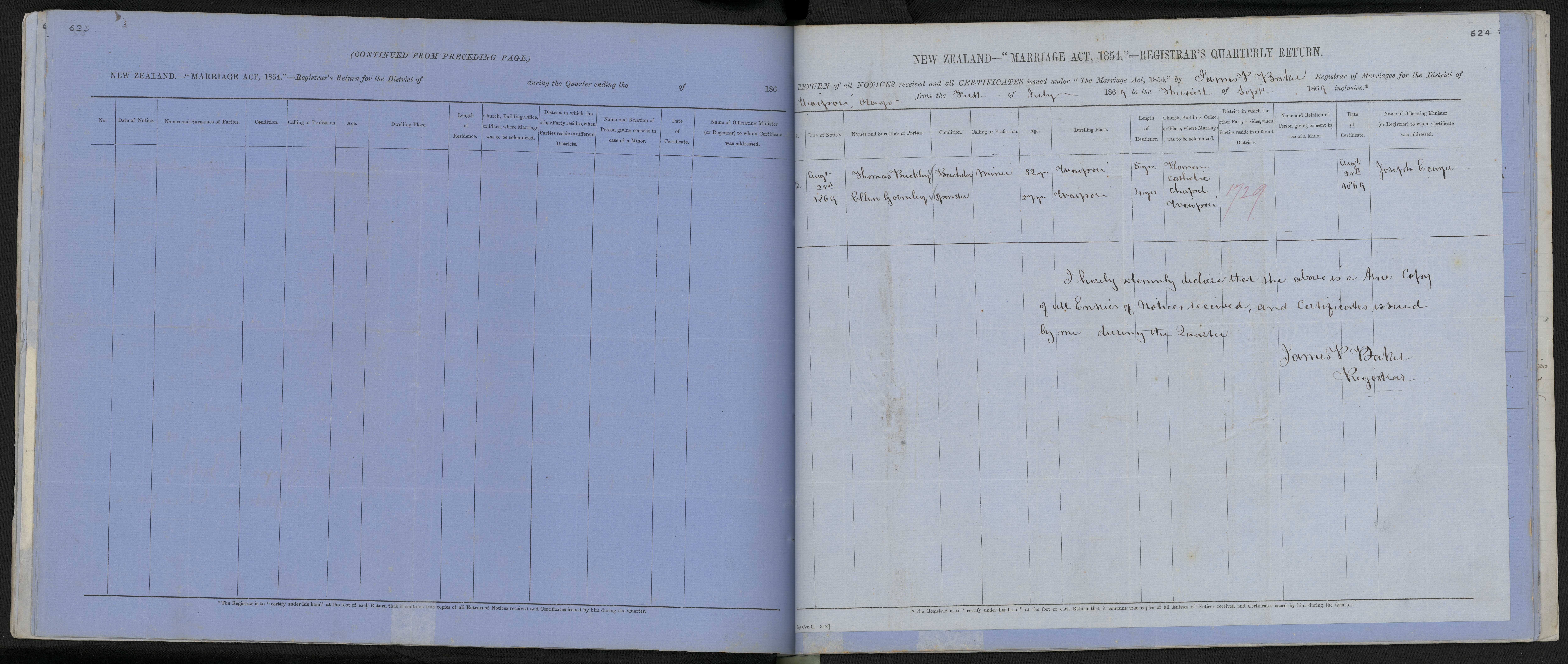 District of Walpori Quarter ending 30 September 1869 Registrar James Payne Baker