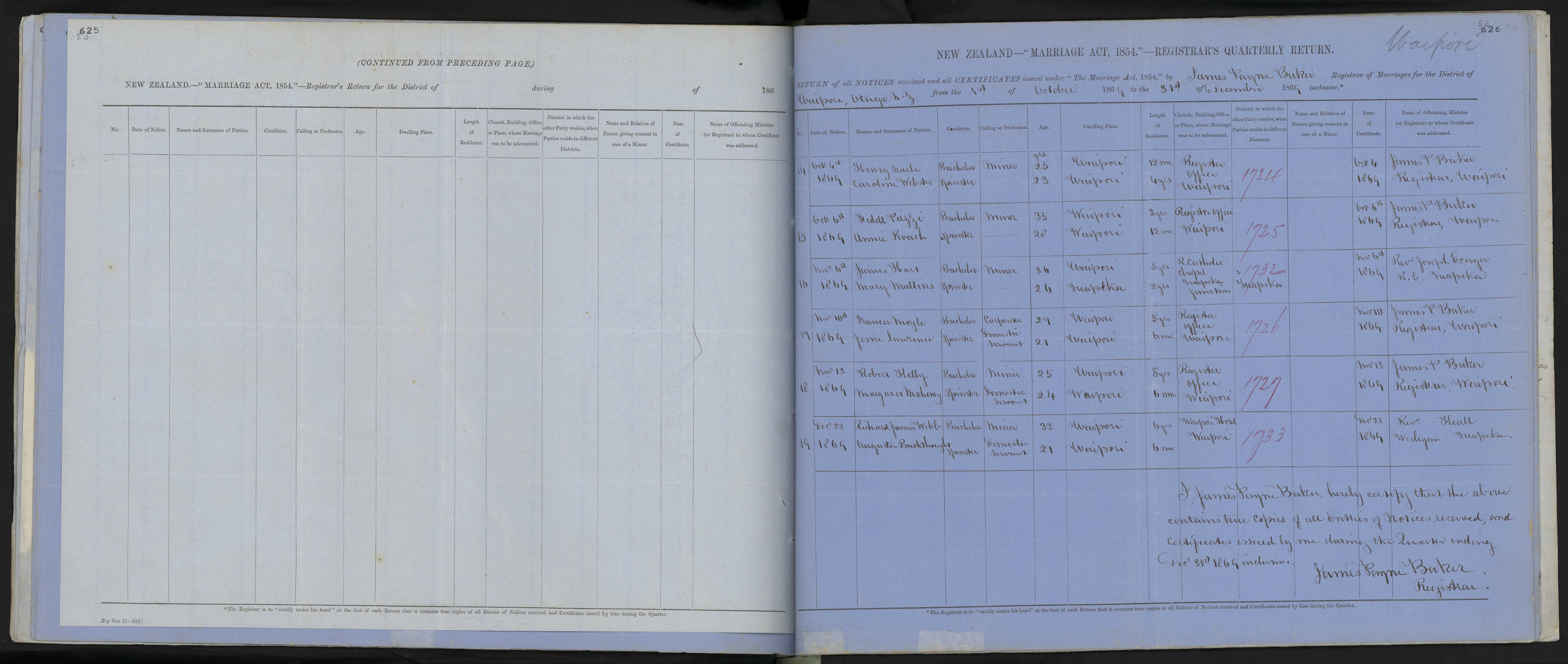 Register Office Waipori | 1726 | 11 November 1869 | James P Baker, Registrar, Waipori | ||||||||||||||||||||||||||||||||||||||||||||||||||