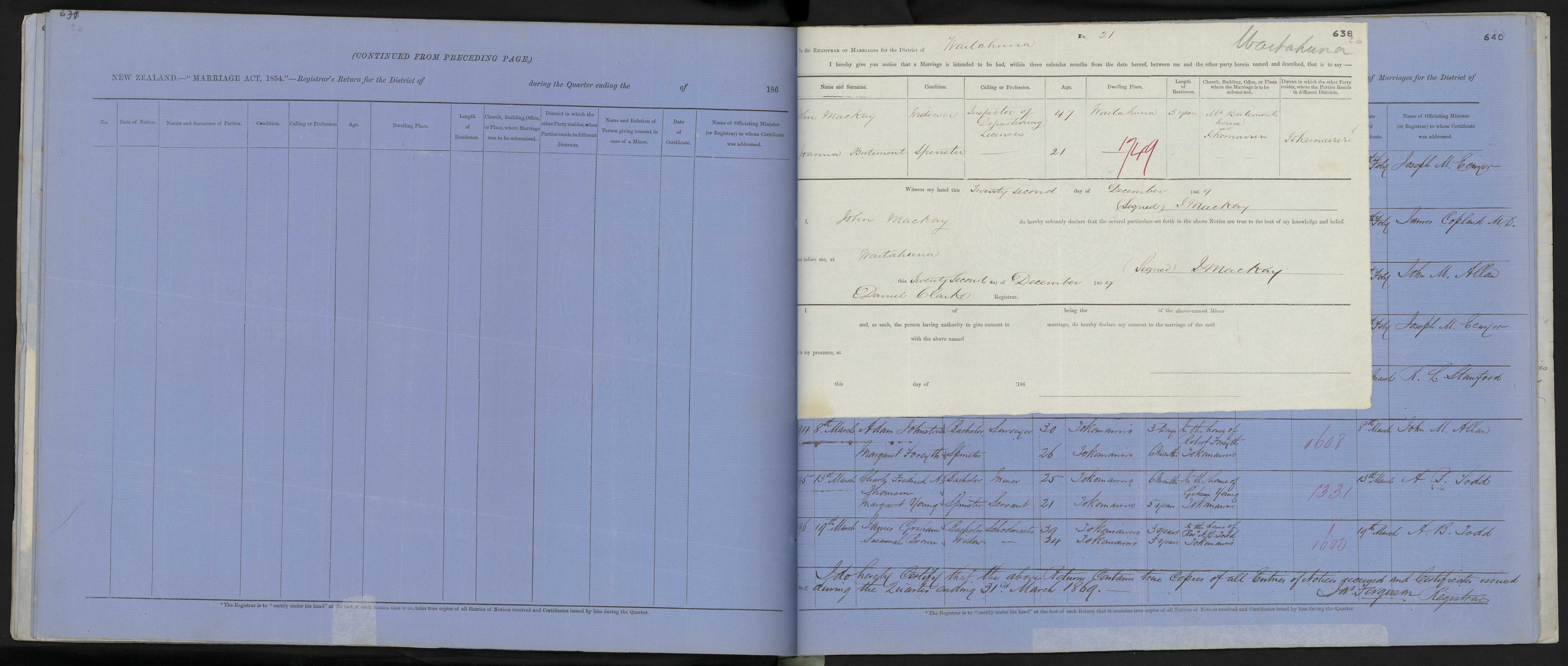 District of Waitahuna Quarter ending 31 March 1869 Registrar Daniel Clarke