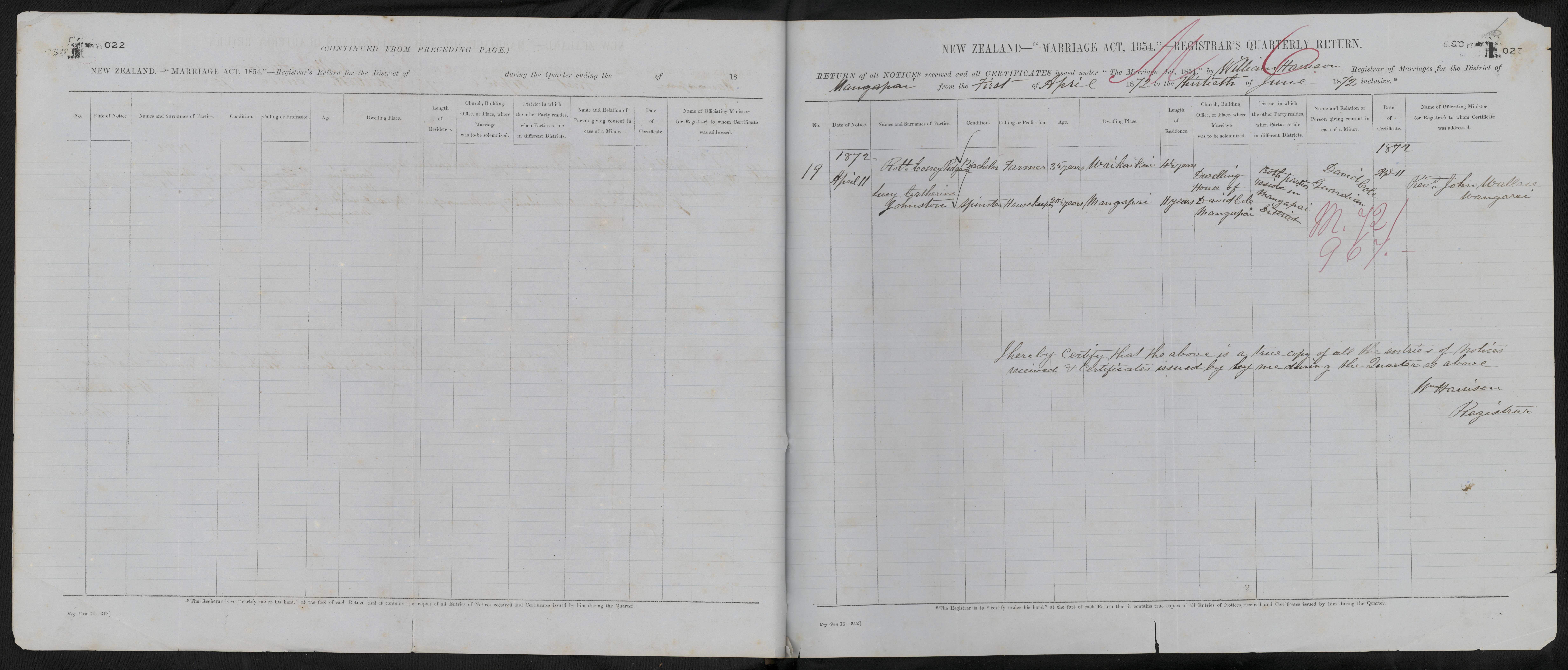 District of Mangapai Quarter ending 30 June 1872 Registrar William Harrison