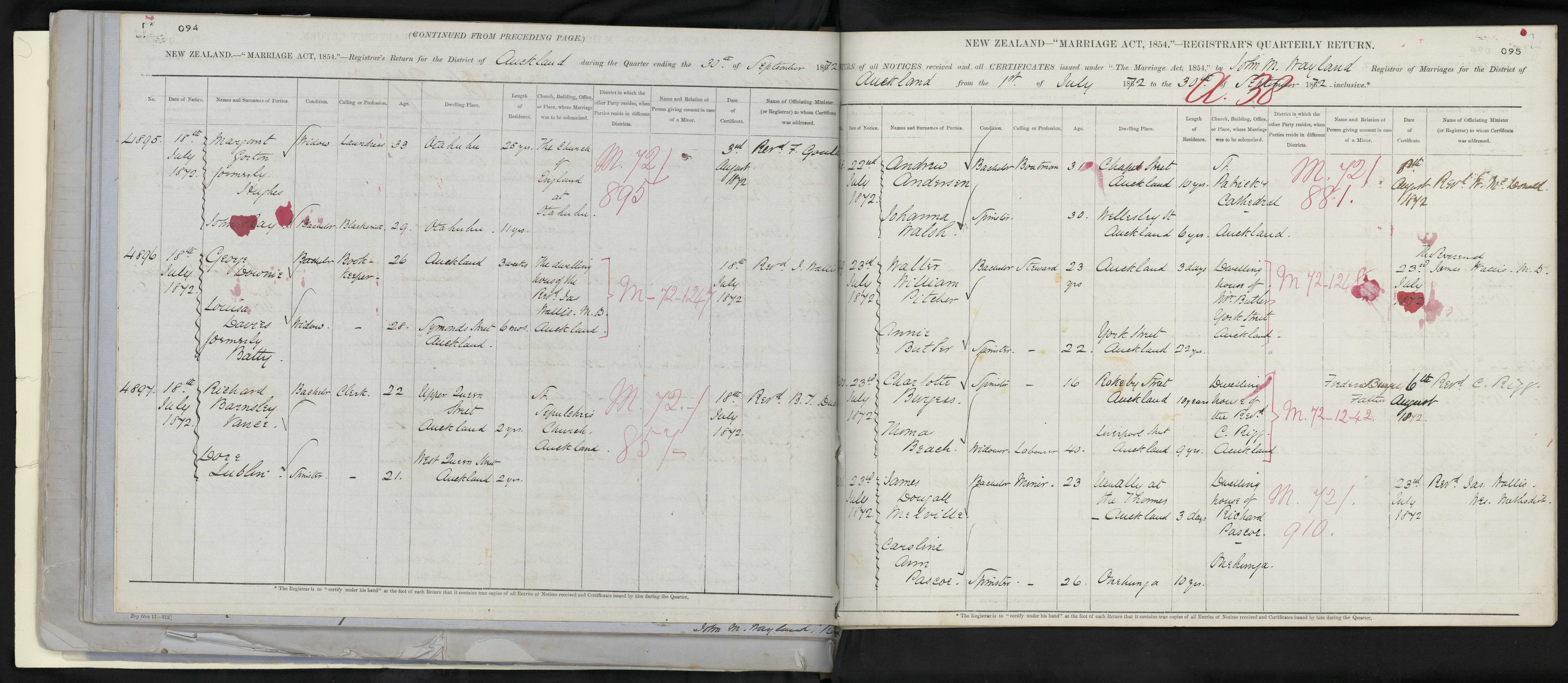 St Sepulchre's Church, Auckland 72/857 18 July 1872 Revd. [? image cut off]