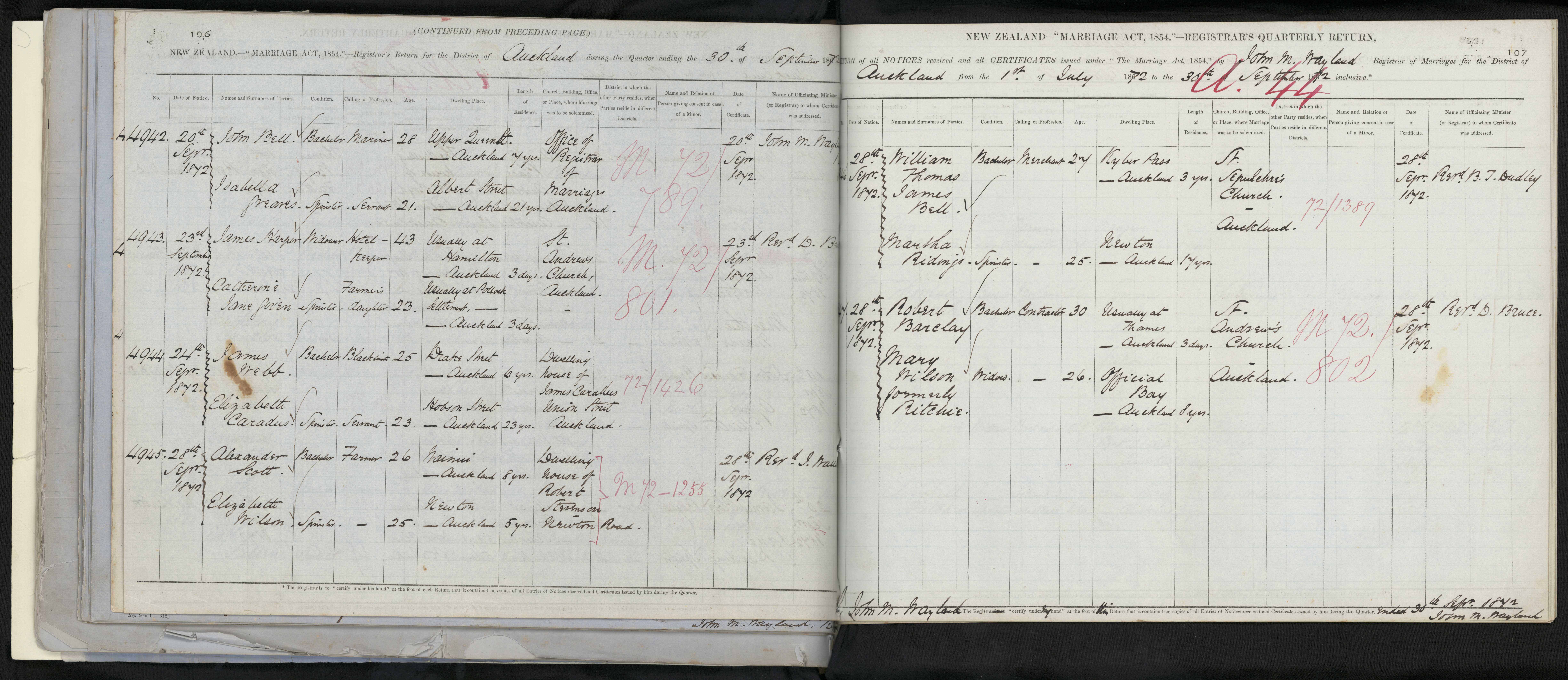 Office of Registrar of Marriages, Auckland 72/789 20 September 1872 John M. Wayland