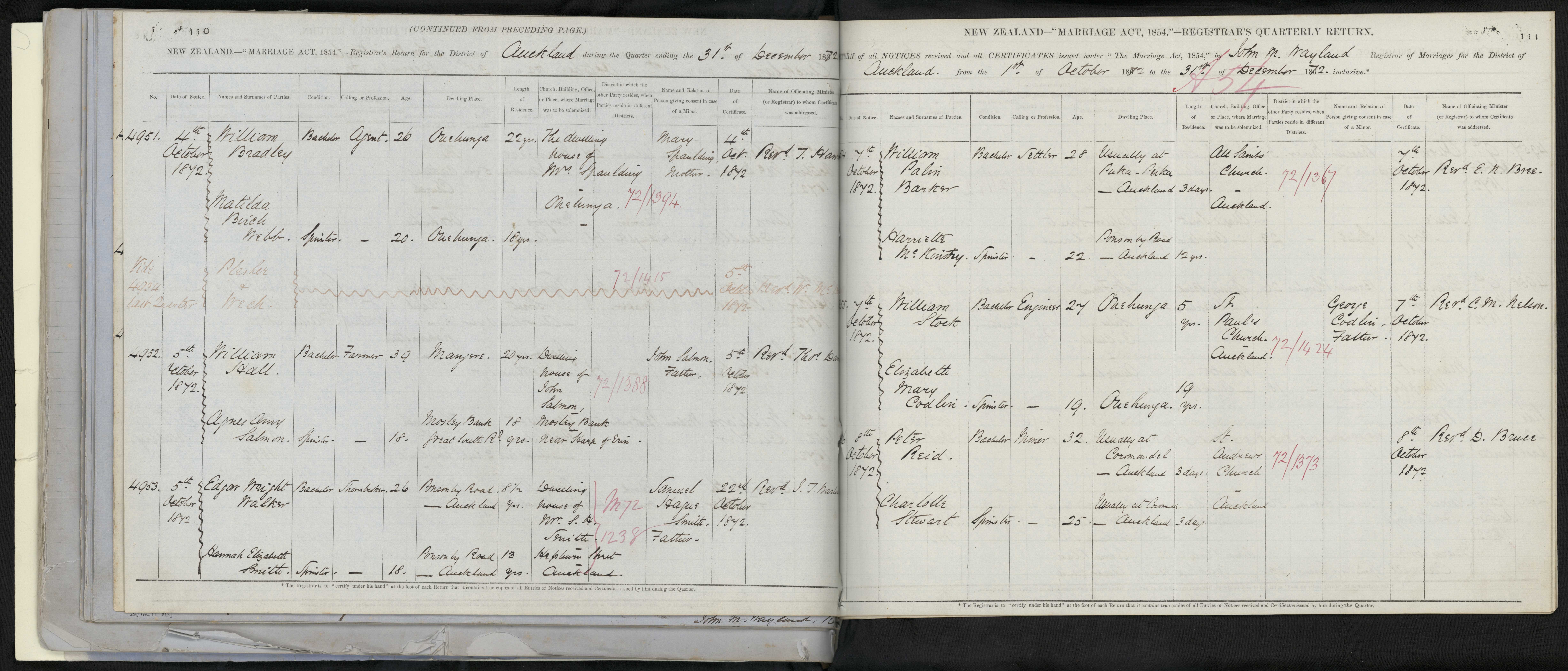 District of Auckland Quarter ending 31 December 1872 Registrar John M. Wayland