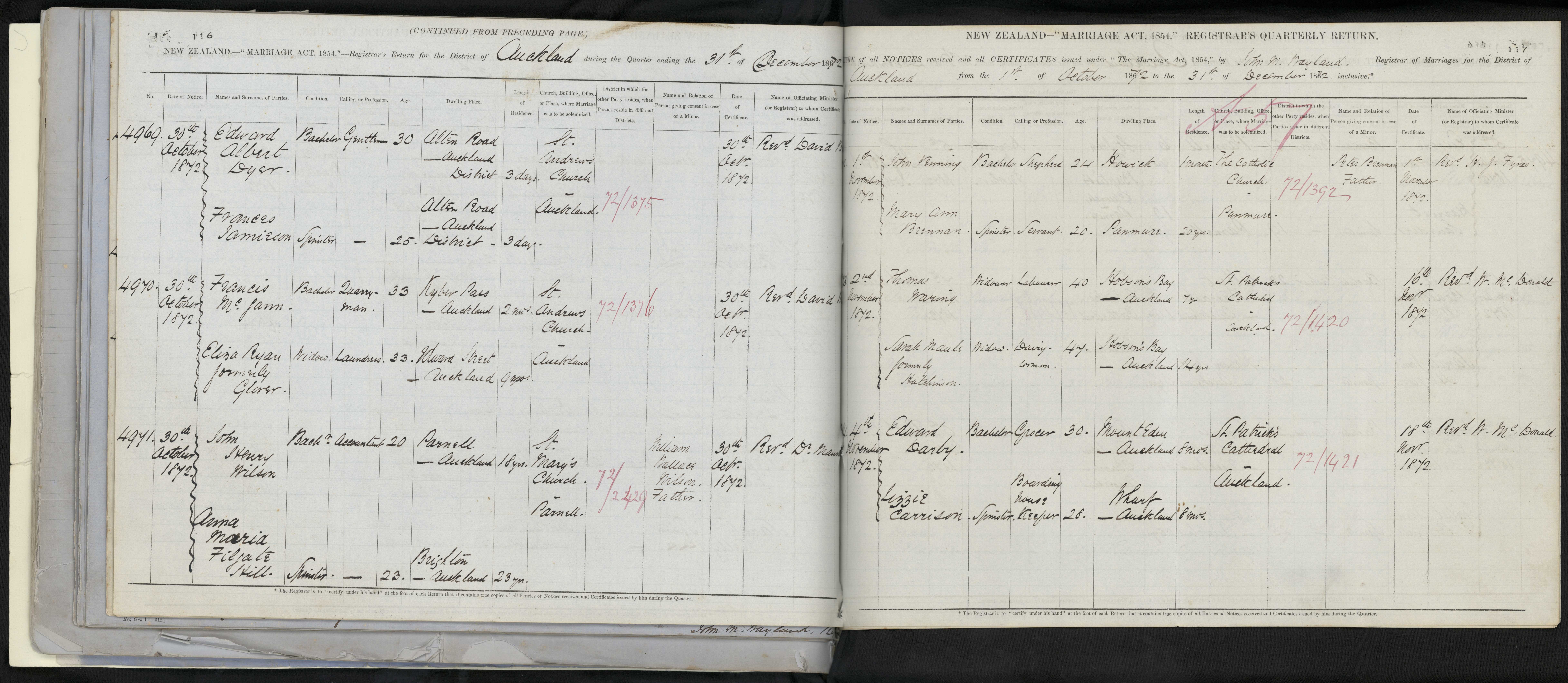 District of Auckland Quarter ending 31 December 1872 Registrar John M. Wayland