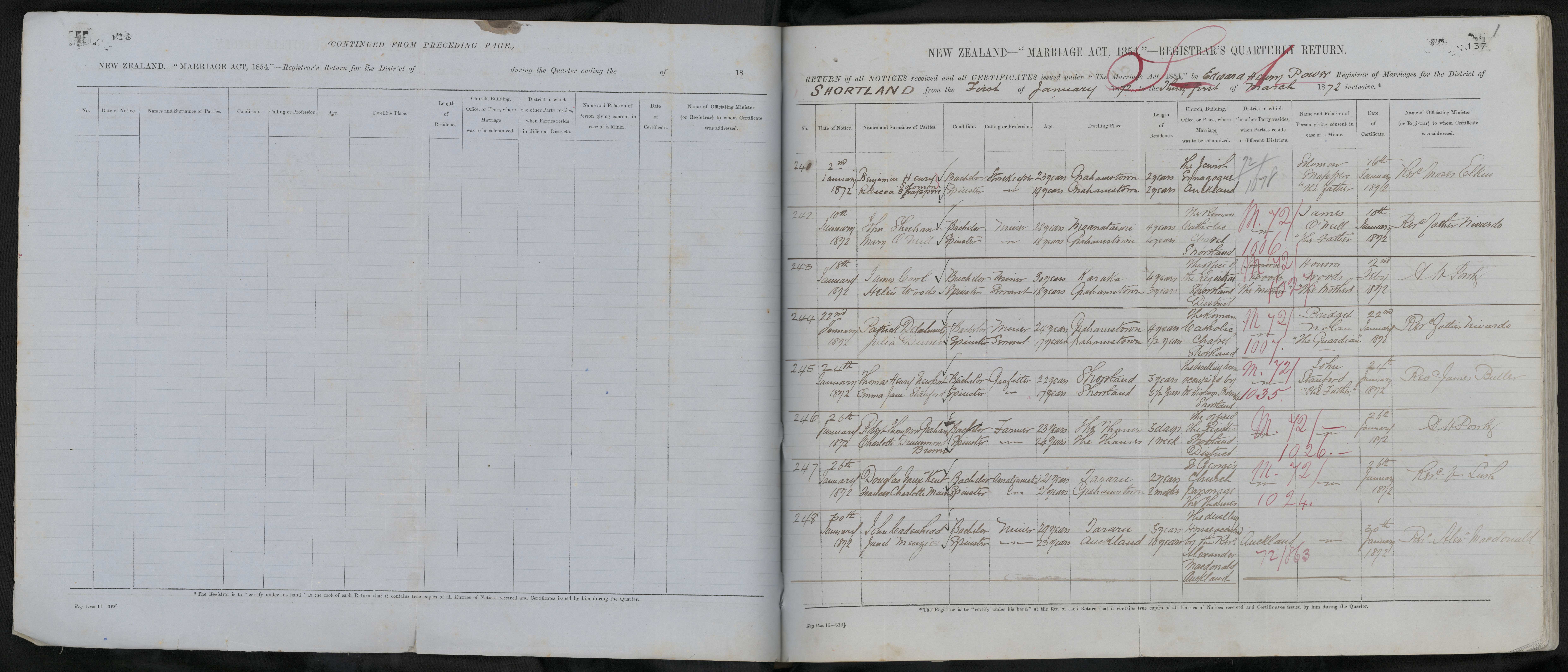 The dwelling house occupied by Mr. Higham, Shoemaker, Shortland | 72/1035 | John Stanford, the father | 24 January 1872 | Revd. James Buller | |||||||||||||||||||||||||||||||||||||||||||||||||