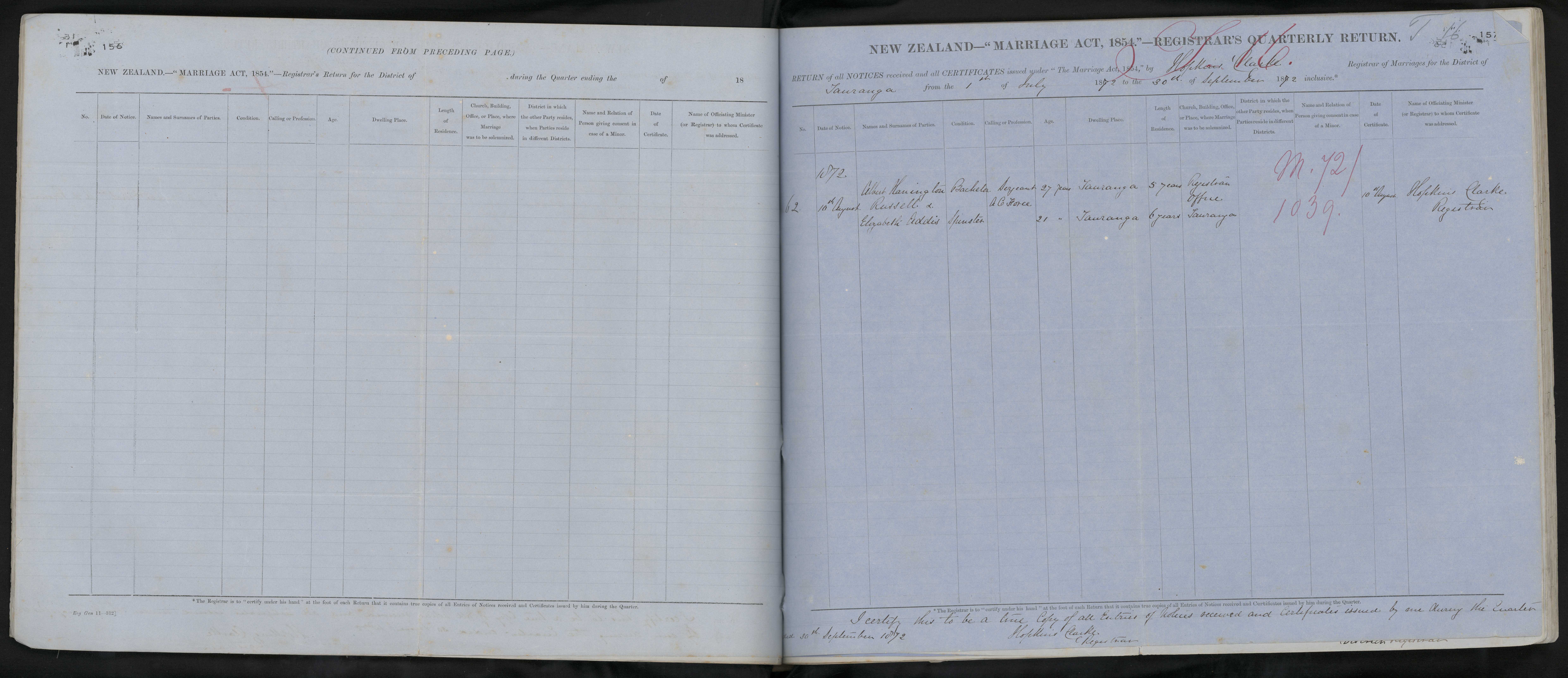 Registrar's Office, Tauranga 72/1039 10 August 1872 Hopkins Clarke, Registrar