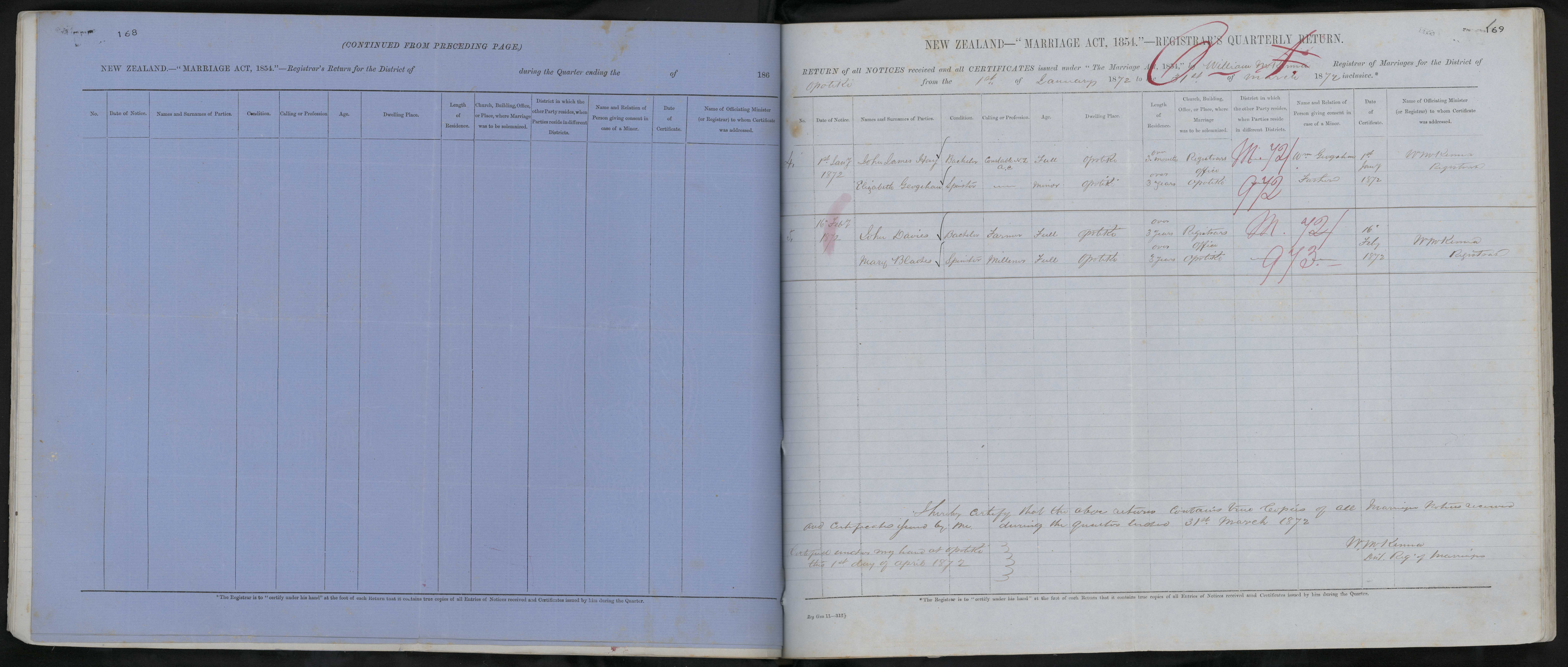 District of Opotiki Quarter ending 31 March 1872 Registrar William McKenna