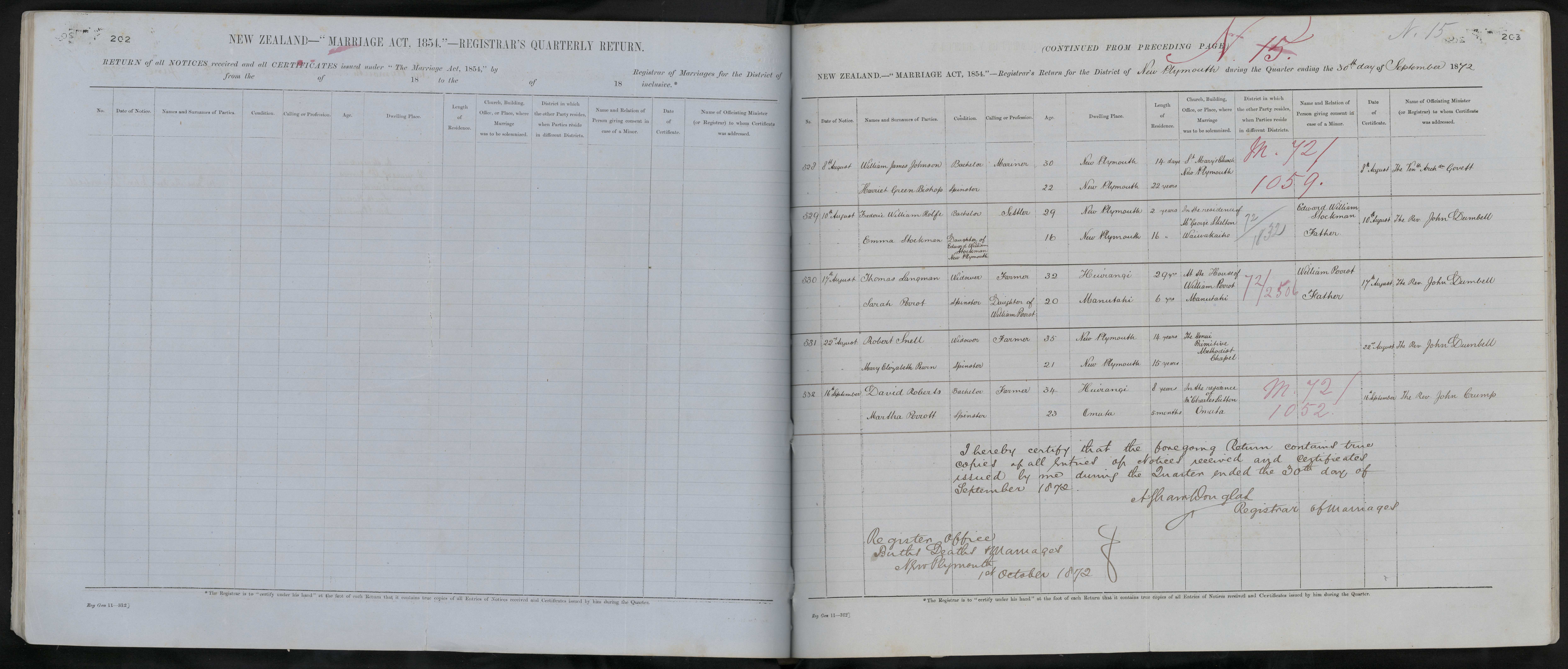 District of New Plymouth Quarter ending 30 September 1872 Registrar A. S. Douglas