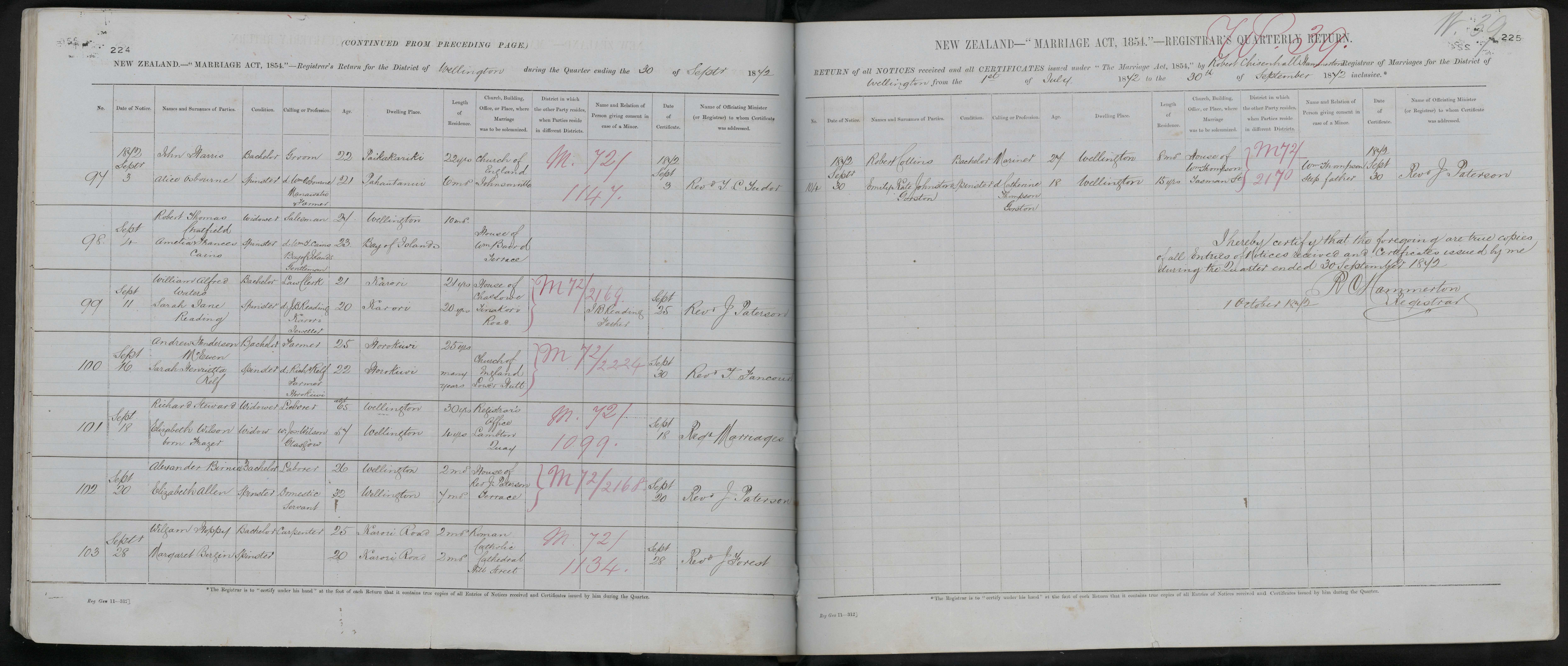 District of Wellington Quarter ending 30 September 1872 Registrar Robert Chisenhall Hammerton & Allan Shaw Douglas