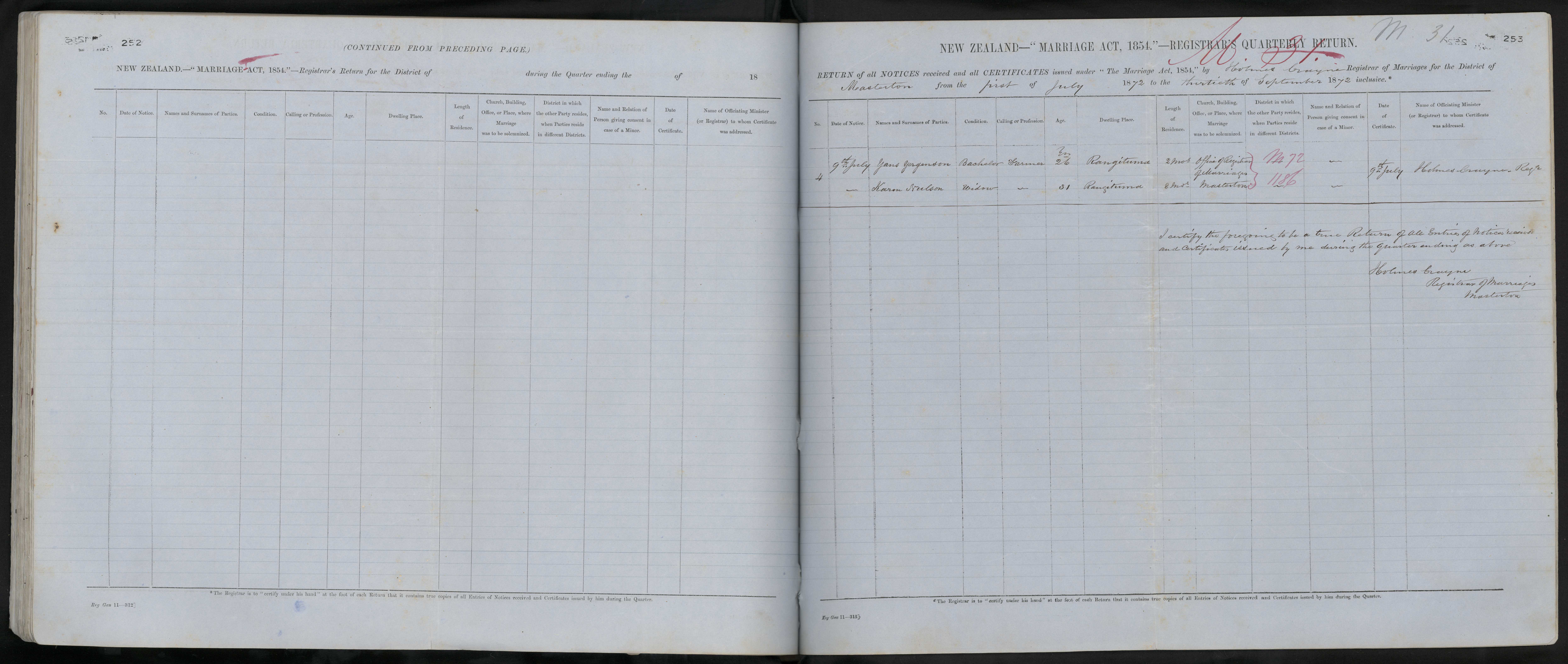 Office of Registrar of Marriages, Masterton 72/1186 9 July 1872 Holmes Crayne, Regr