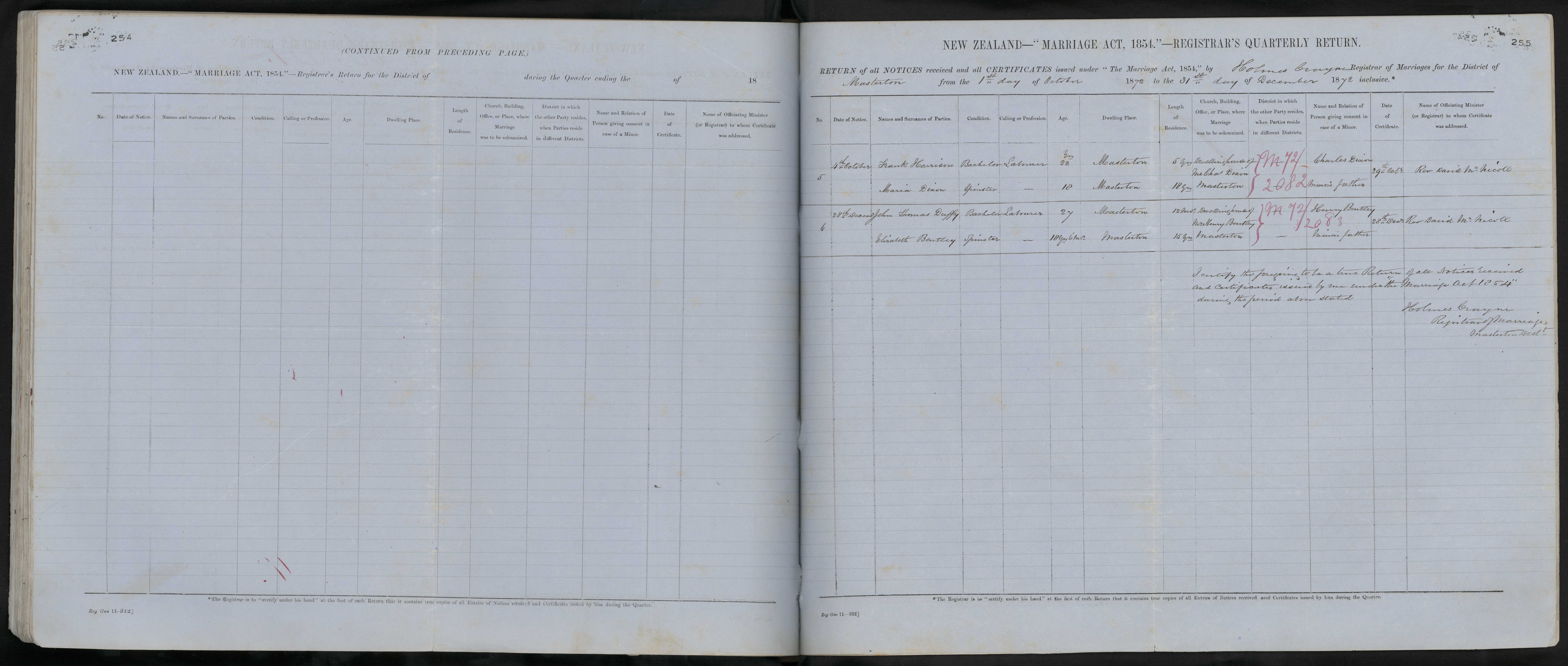 District of Masterton Quarter ending 31 December 1872 Registrar Holmes Crayne