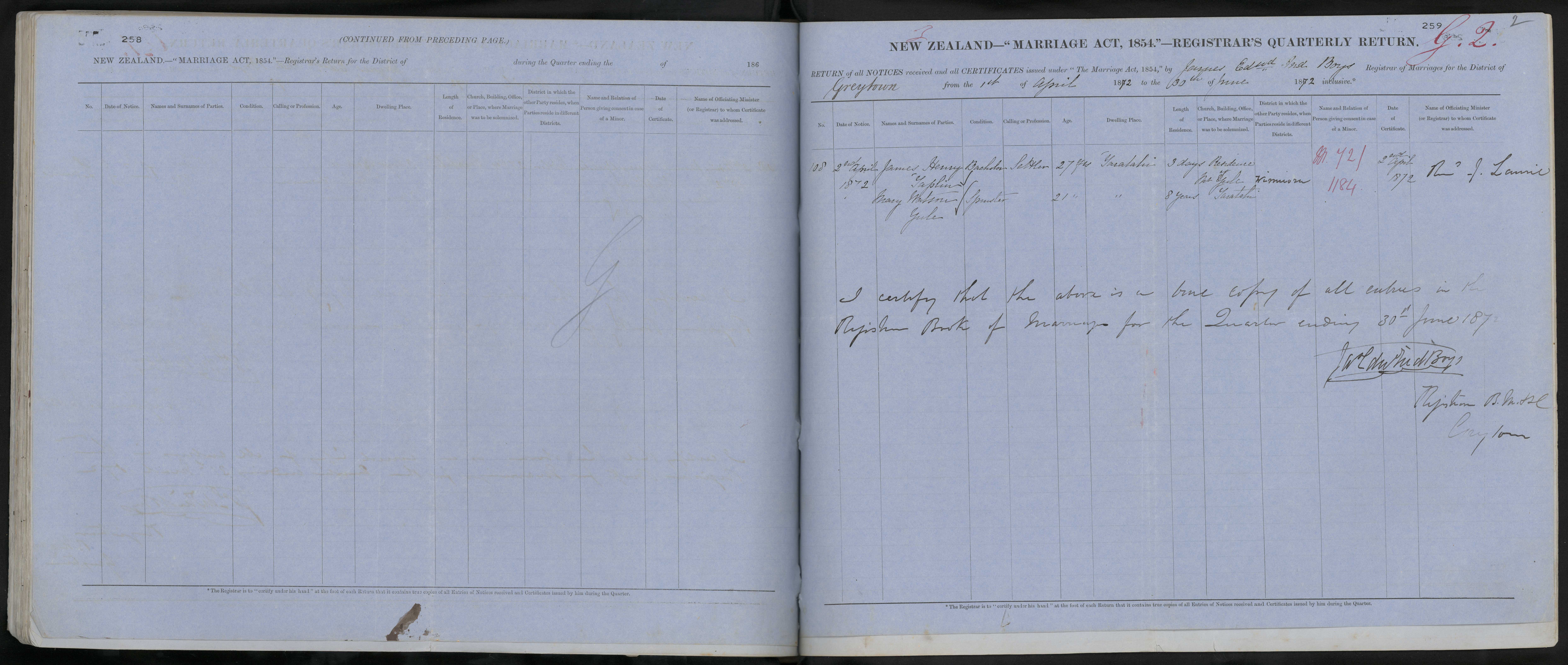 District of Greytown Quarter ending 30 June 1872 Registrar James E. I. Boys