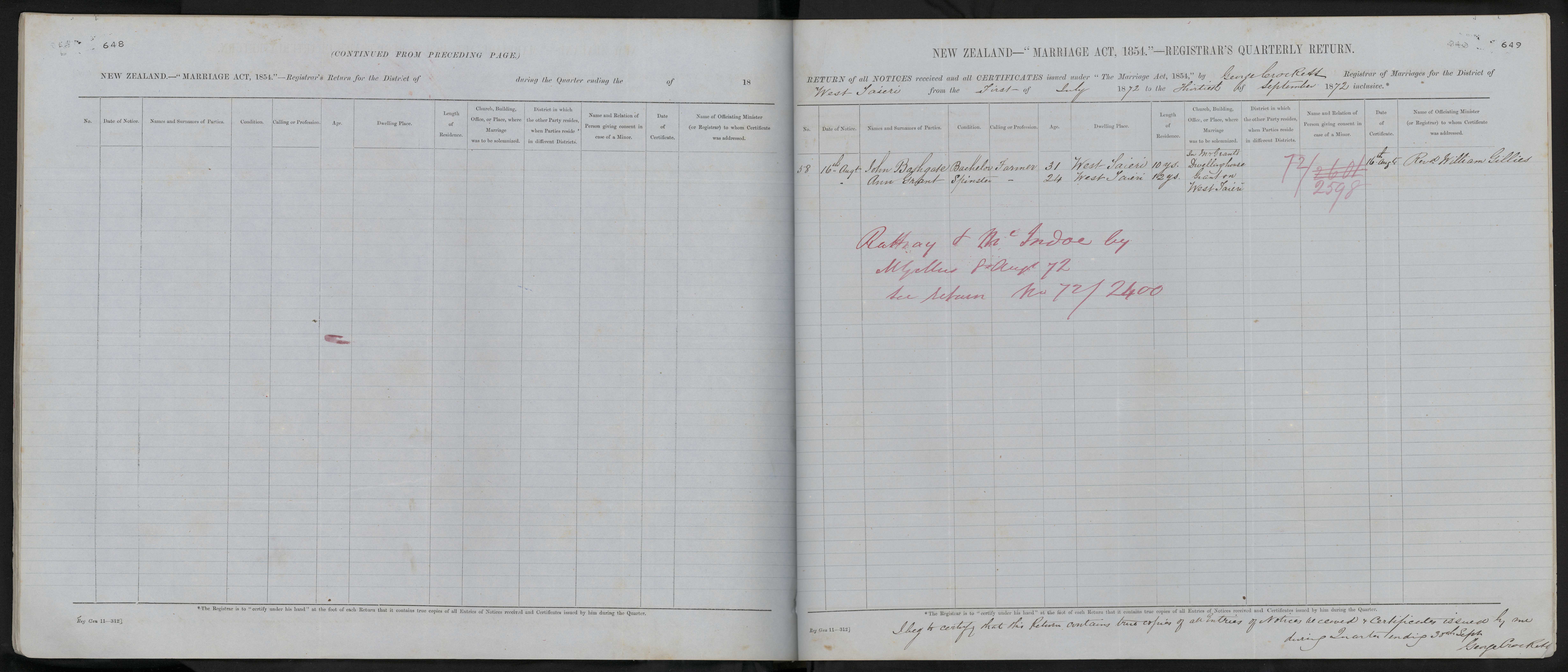 District of West Taieri Quarter ending 30 September 1872 Registrar George Crockett
