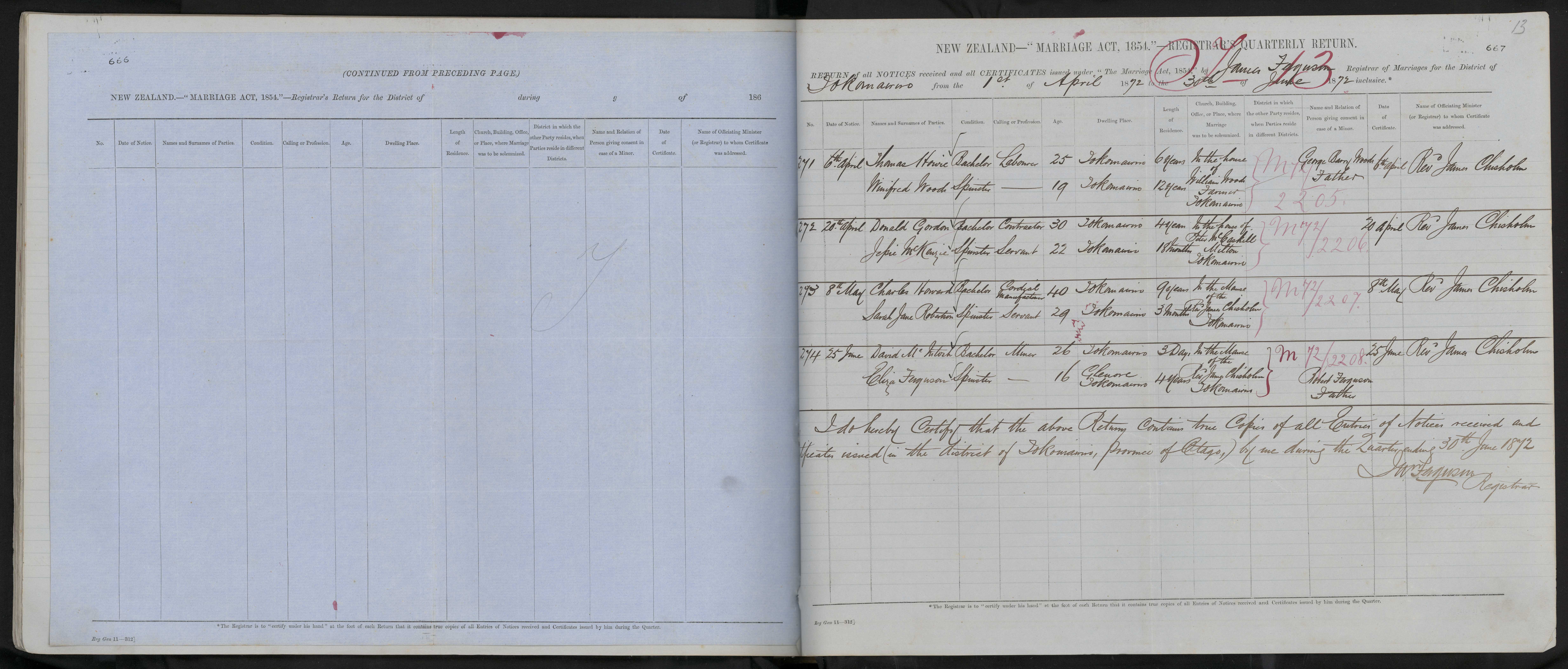 District of Tokomairiro Quarter ending 30 June 1872 Registrar James Ferguson