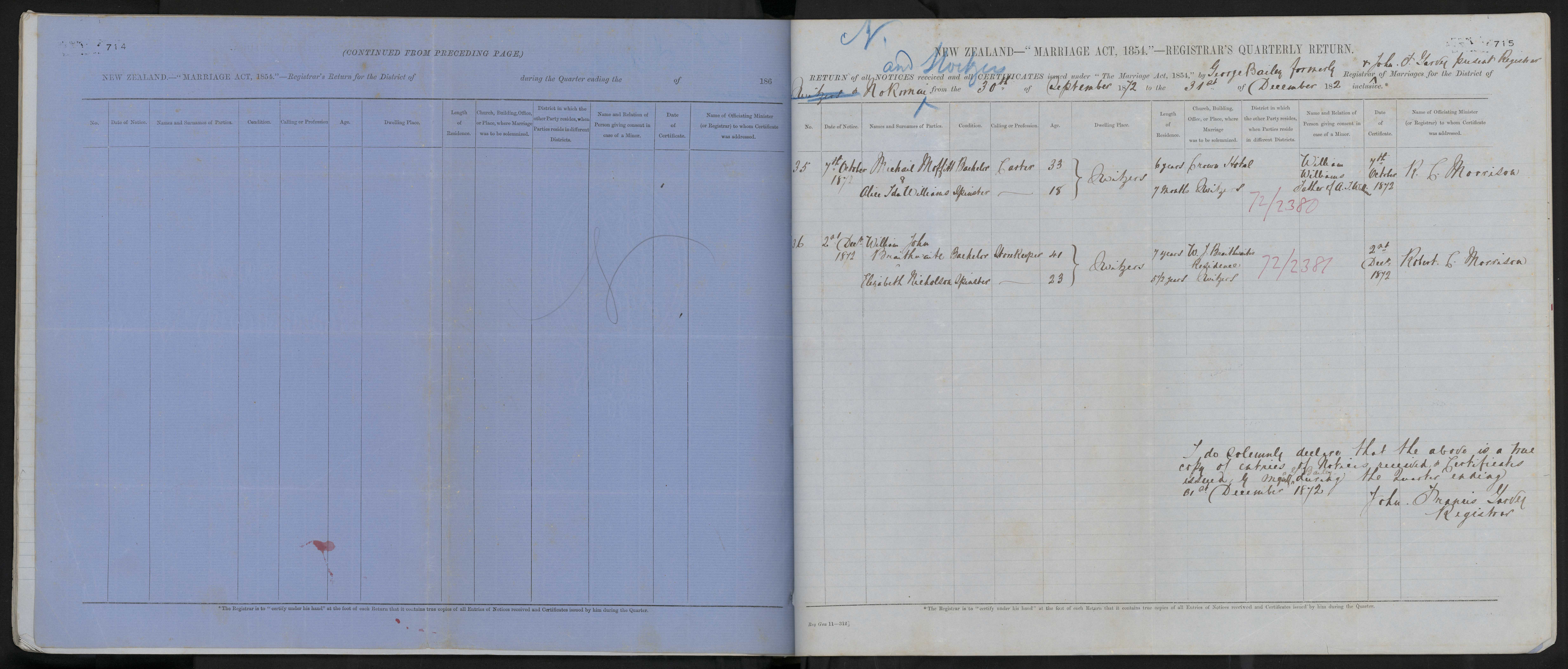 District of Nokomai & Switzers Quarter ending 31 December 1872 Registrar George Bailey formerly & John F Garvey present Registrar