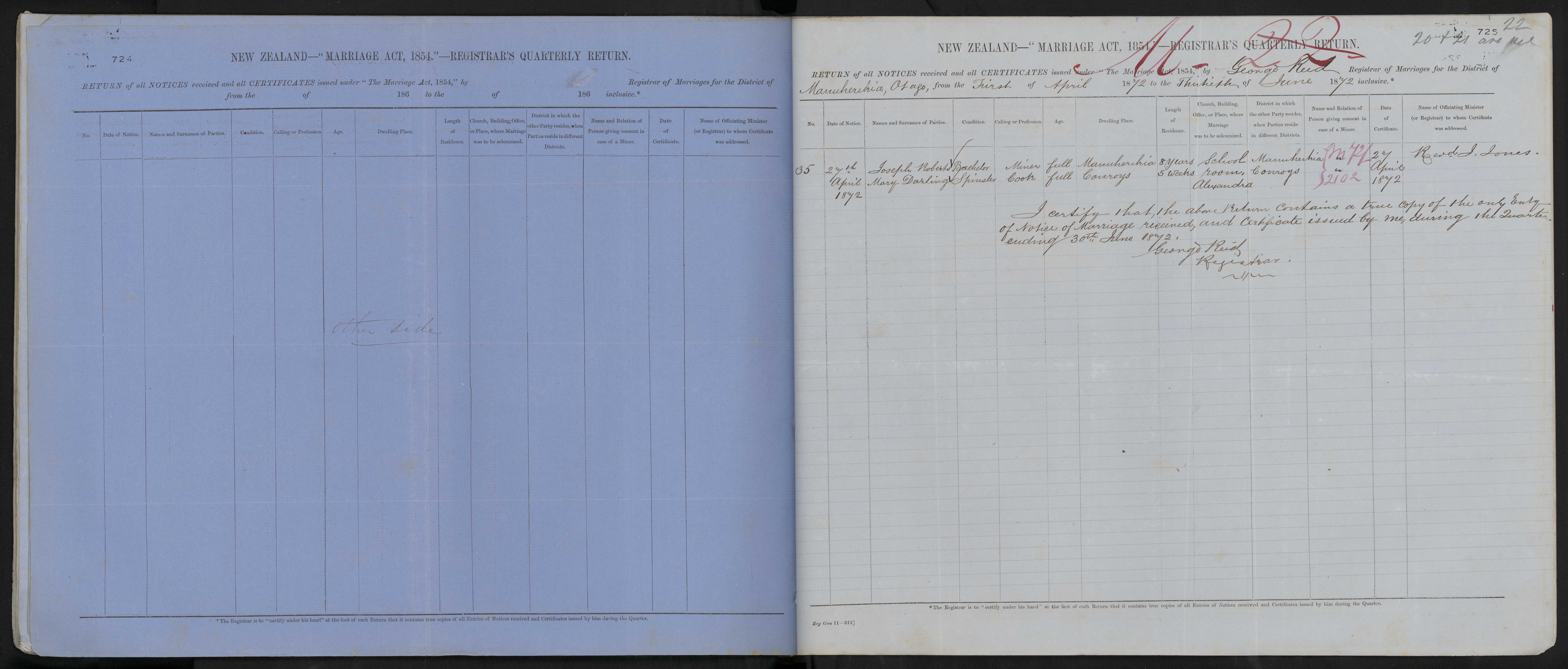 District of Manuherikia Quarter ending 30 June 1872 Registrar George Reid