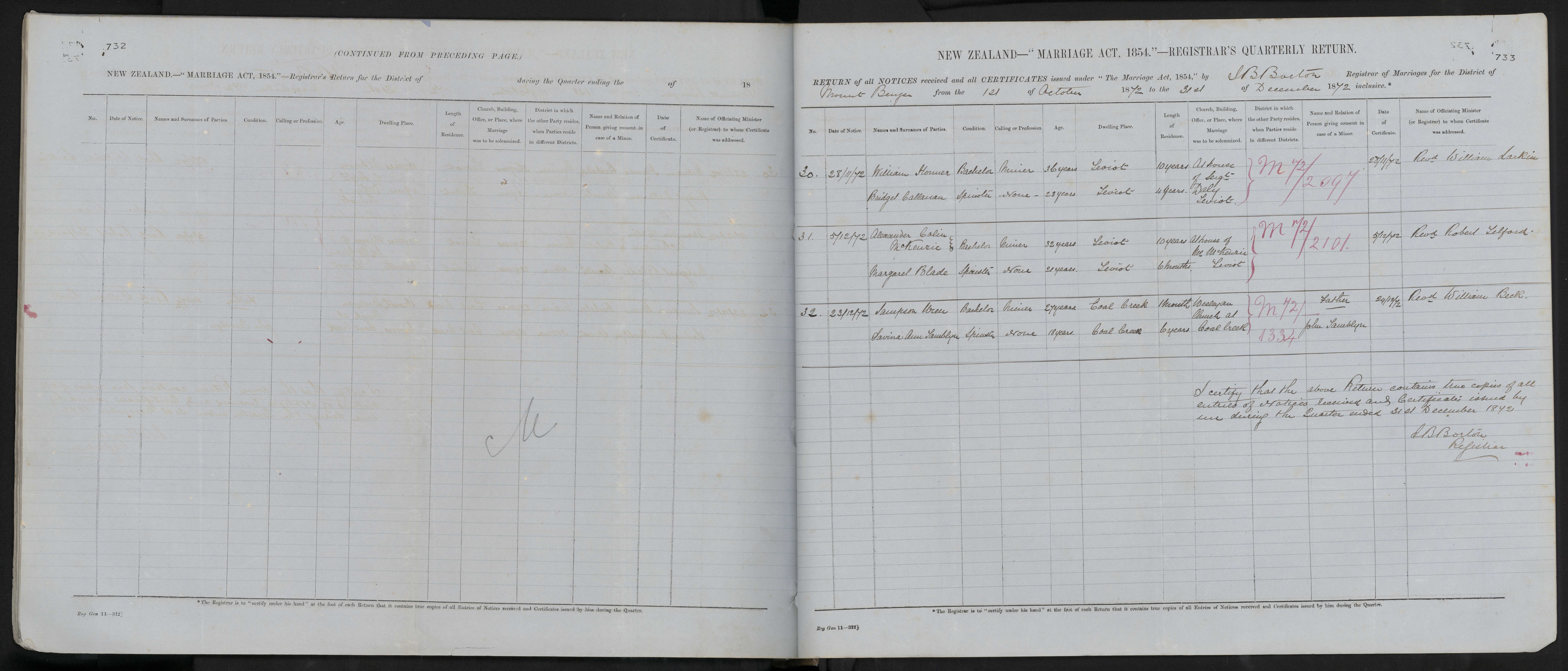 District of Mount Benger Quarter ending 31 December 1872 Registrar J B Borton