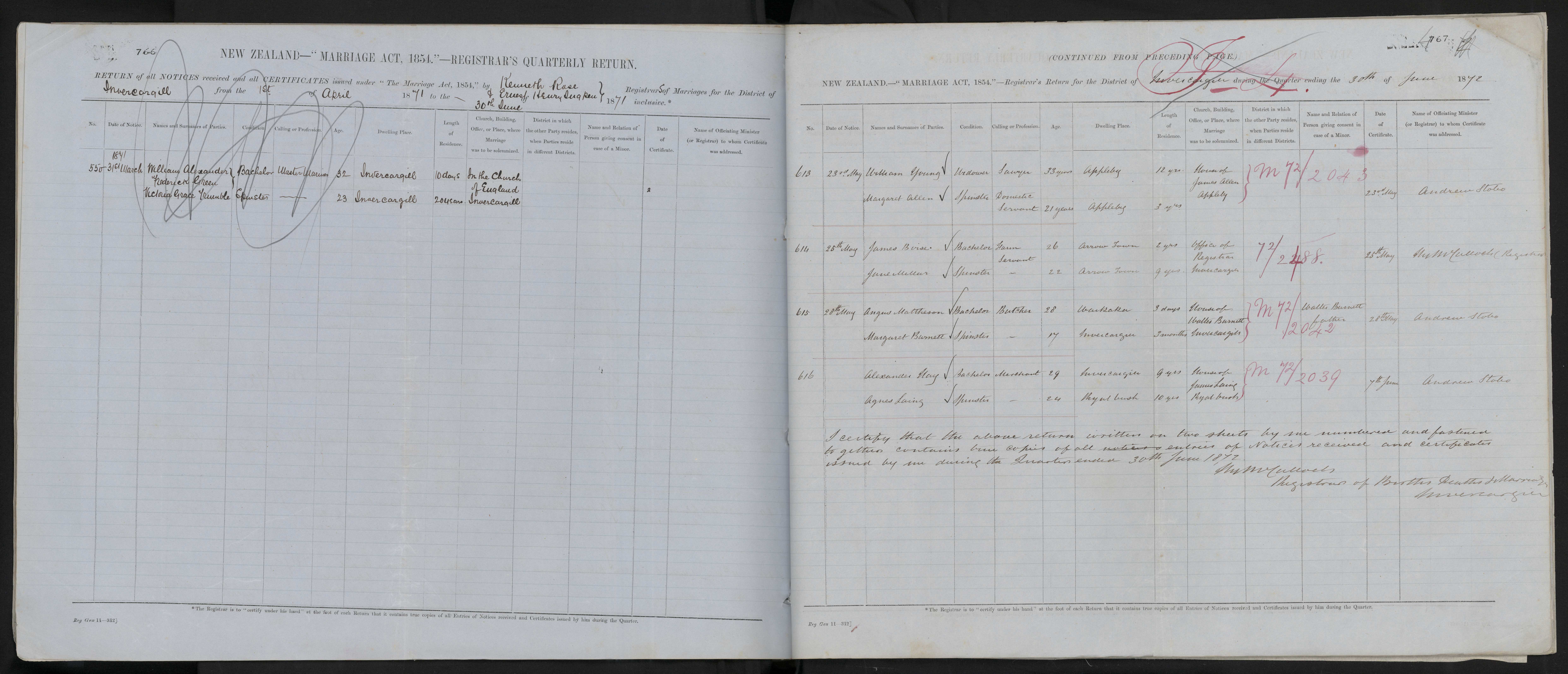 District of Invercargill Quarter ending 30 June 1871 Registrar Kenneth Rose & Ernest Henry Sugden