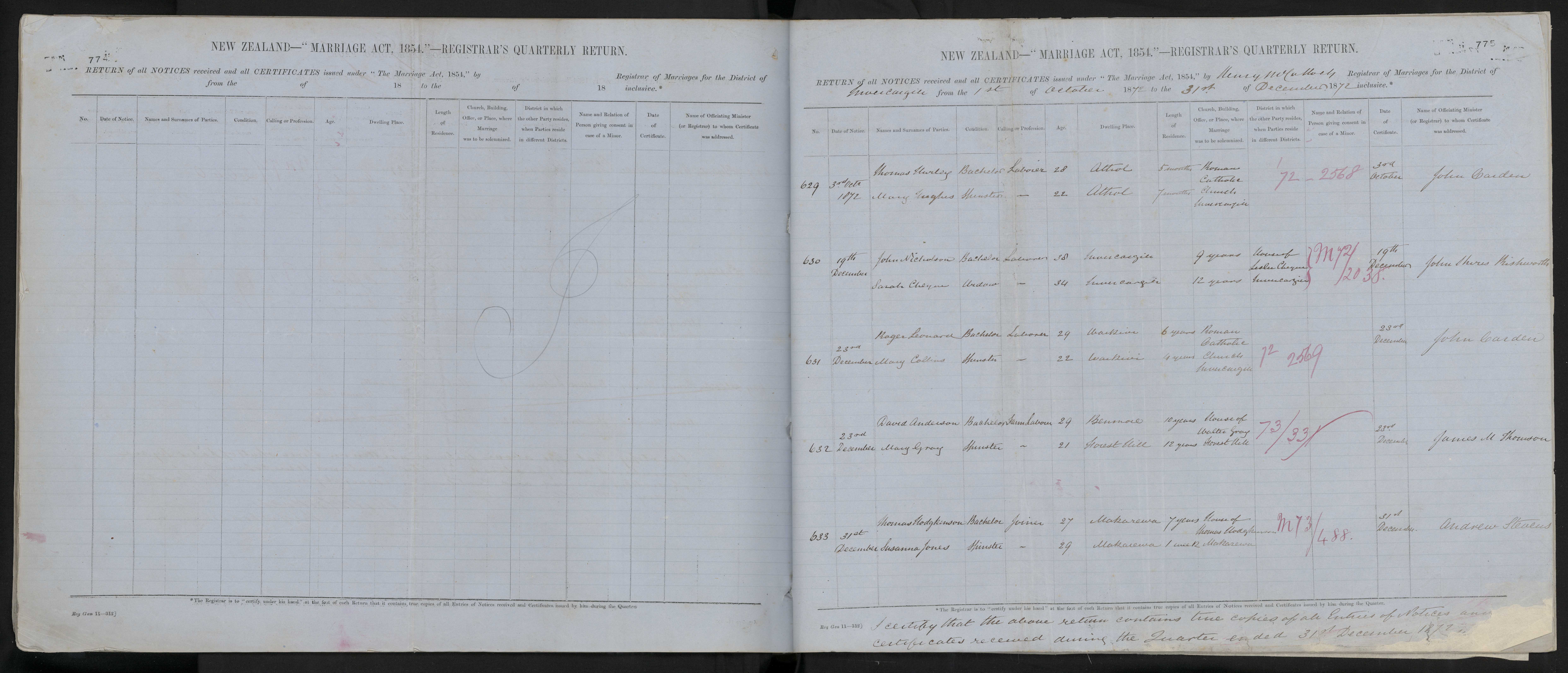 District of Invercargill Quarter ending 31 December 1872 Registrar Henry McCulloch