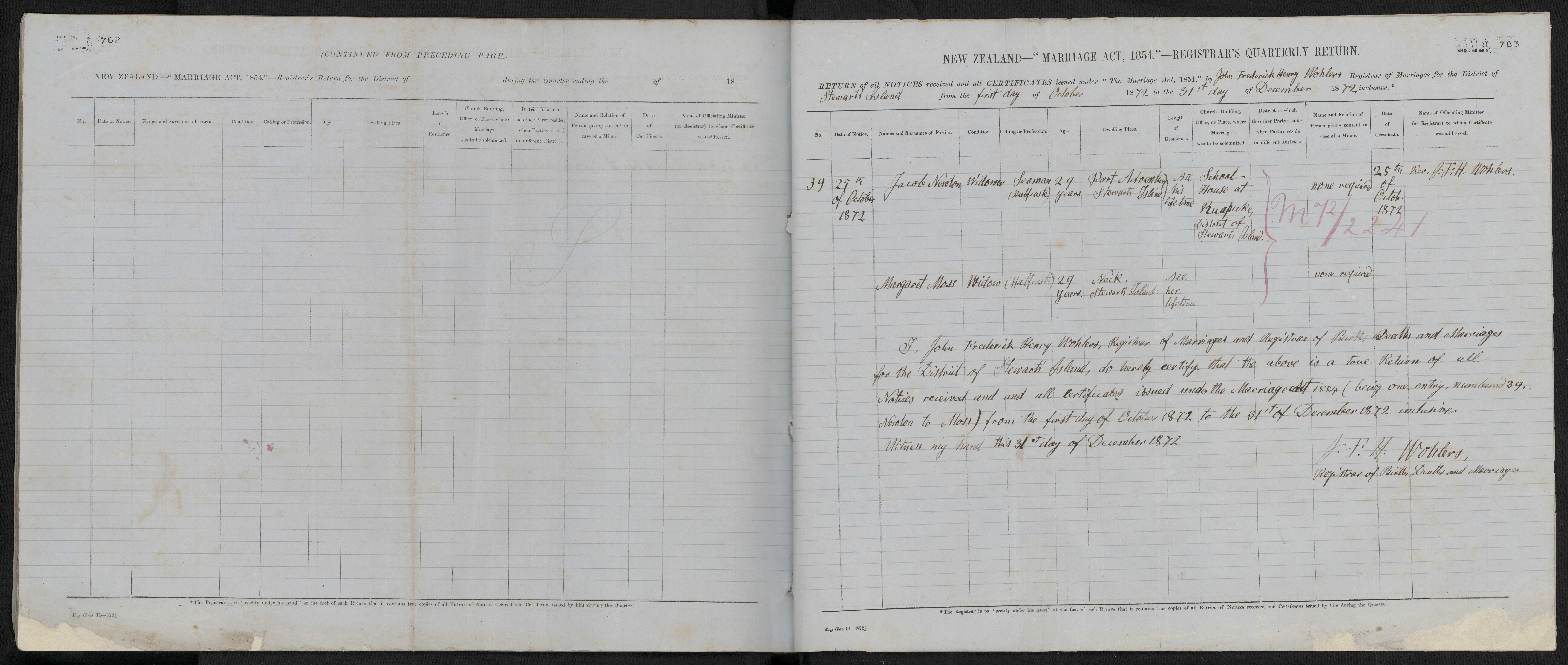 District of Stewart Island Quarter ending 31 December 1872 Registrar John Frederick Henry Wohlers