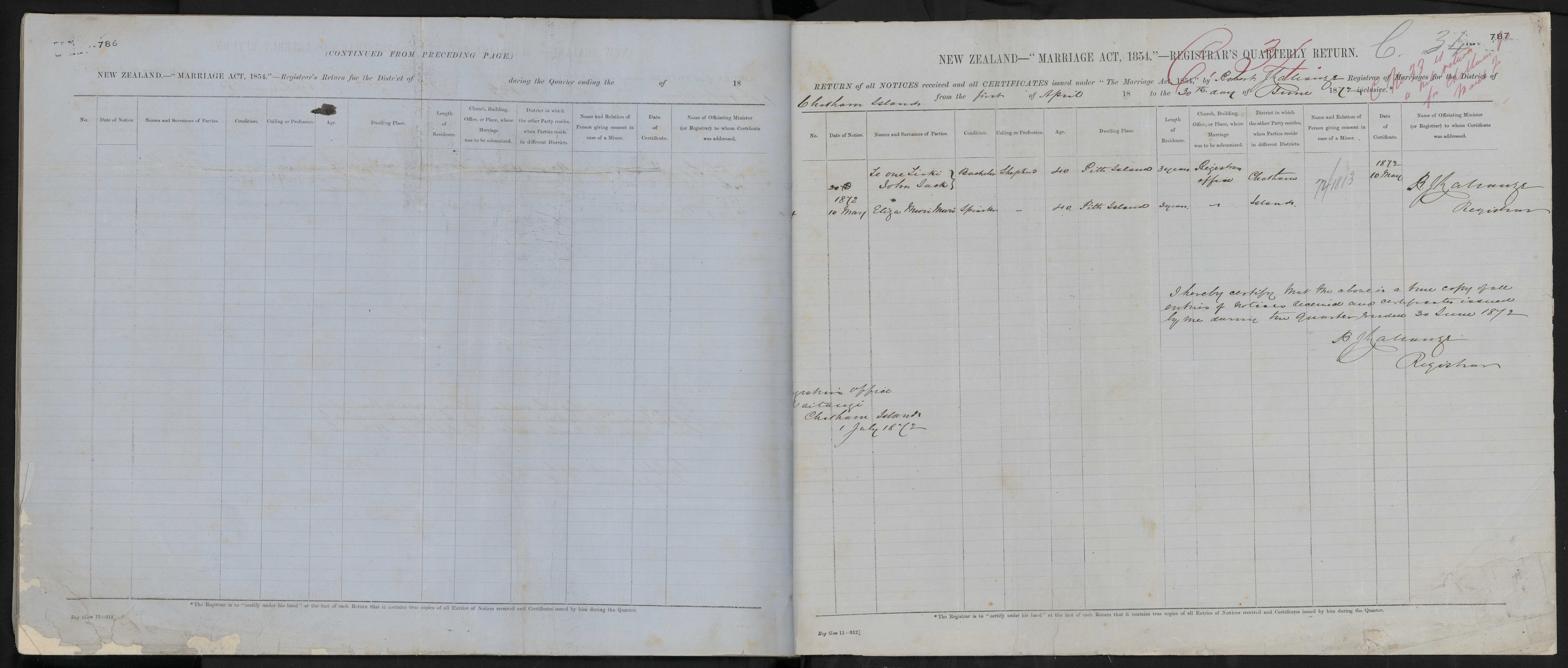 Registrar's Office, Chatham Islands 72/1813 10 May 1872 R J Lahauze Registrar
