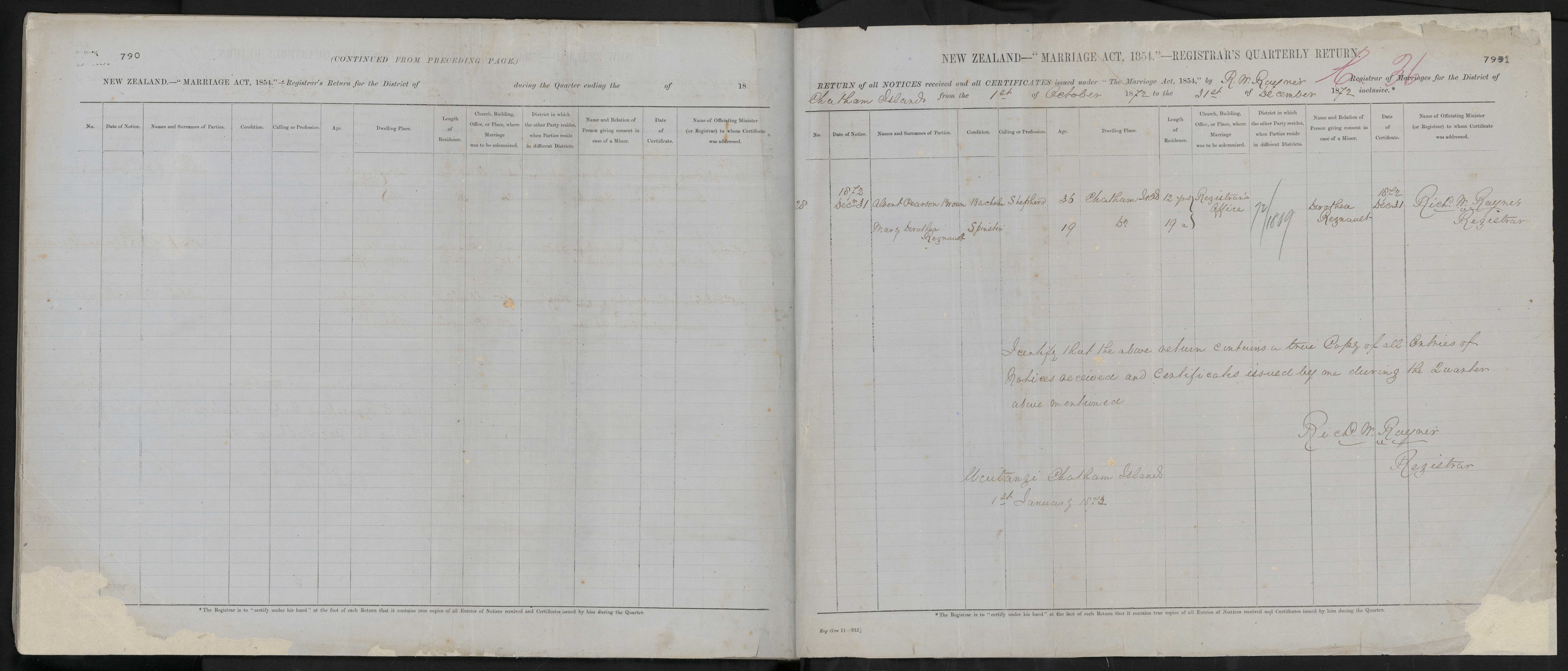 District of Chatham Islands Quarter ending 31 December 1872 Registrar R W Rayner