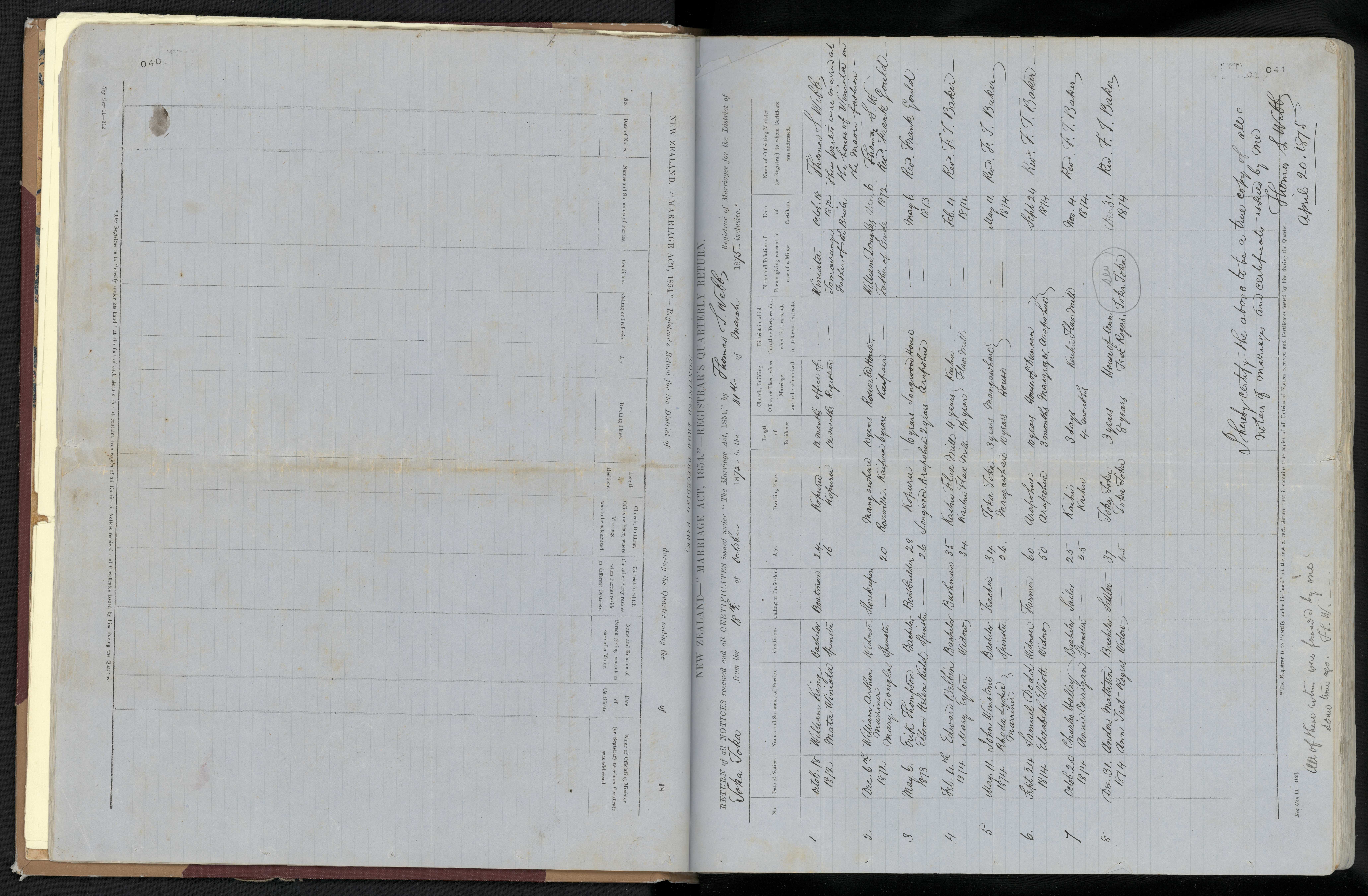 District of Toka Toka Quarter ending 18 October 1872 - 31 March 1875 Registrar Thomas S. Webb| No | Date of Notice | Names and Surnames of Parties | BDM Match | Condition | Calling or Profession | Age | Dwelling Place | Length of Residence | Marriage Place | Folio | Consent | Date of Certificate | Officiating Minister | ||||||||||||||||||||||||||||||||||||||||||||||||