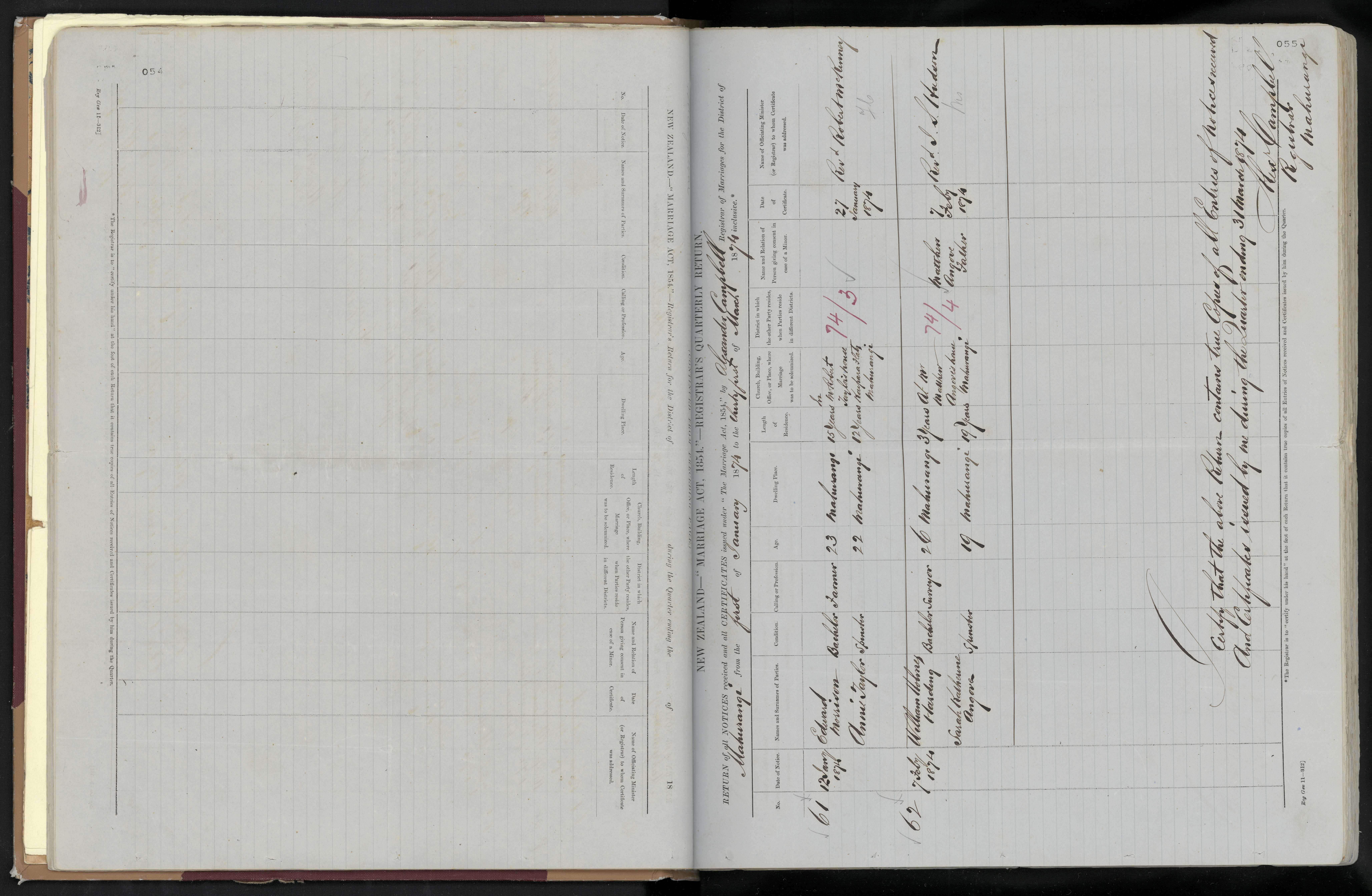 District of Mahurangi Quarter ending 31 March 1874 Registrar Alexander Campbell