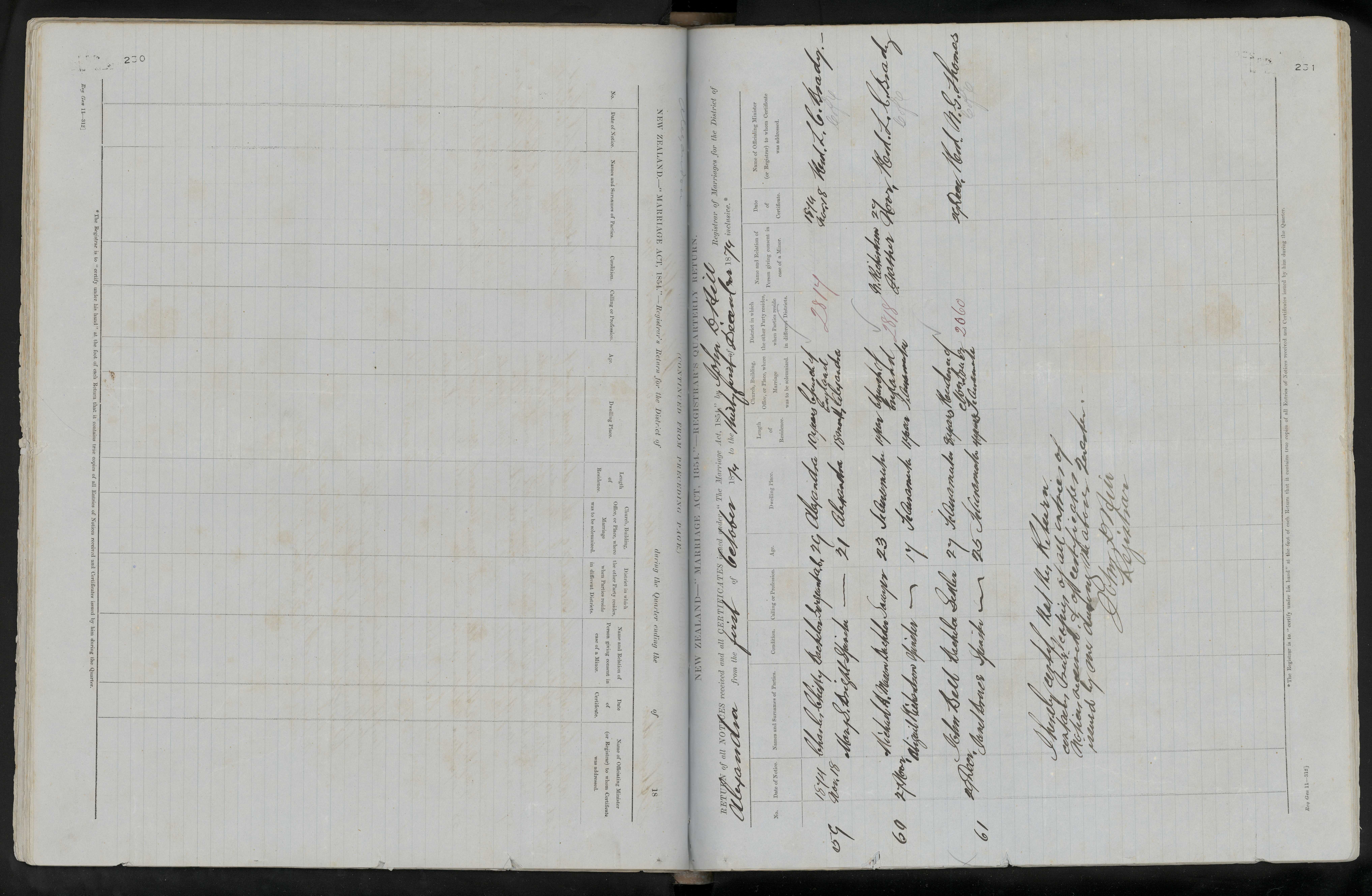 District of Alexandra Quarter ending 31 December 1874 Registrar John D Hill