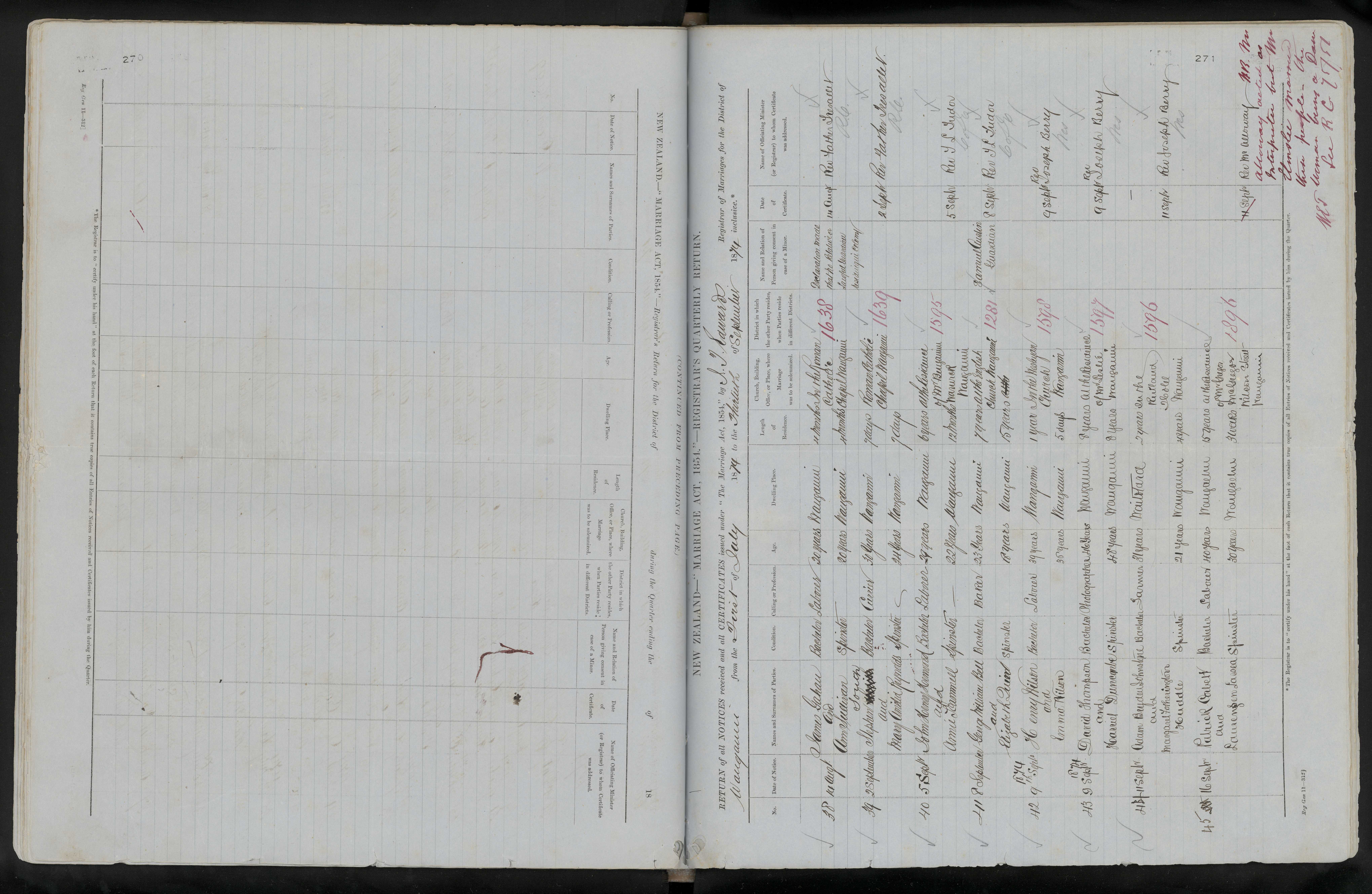 At the Residence of Mr Gregor McGregor, Wilson Street, Wanganui | 74/1896 | 16 September 1874 | Rev Mr Alloway [NB Mr Alloway acted as interpreter but Mr Elmslie married these people the woman being a Dane. See R G 1751] | ||||||||||||||||||||||||||||||||||||||||||||||||||