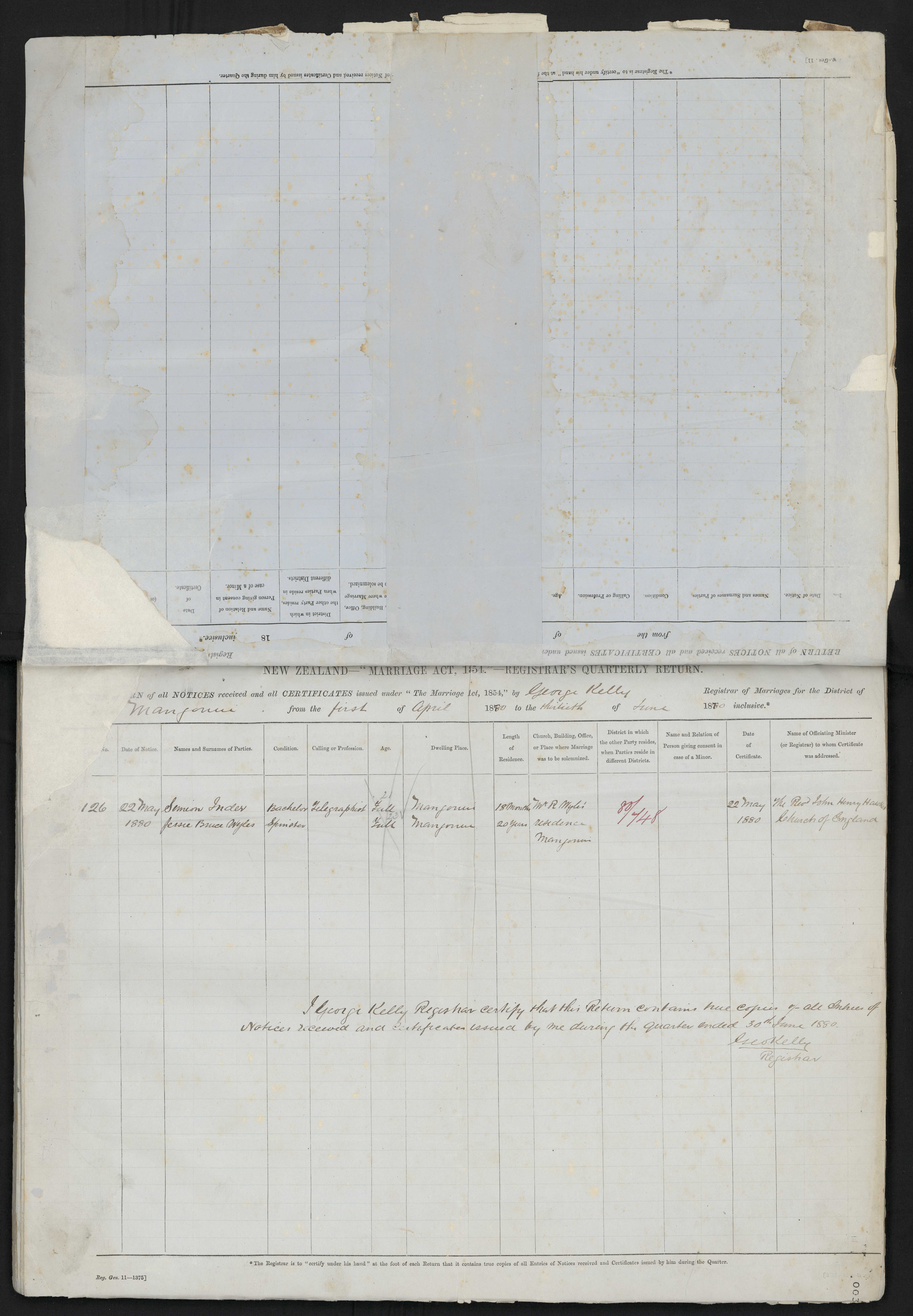 District of Mangonui Quarter ending 30 June 1880 Registrar George Kelly