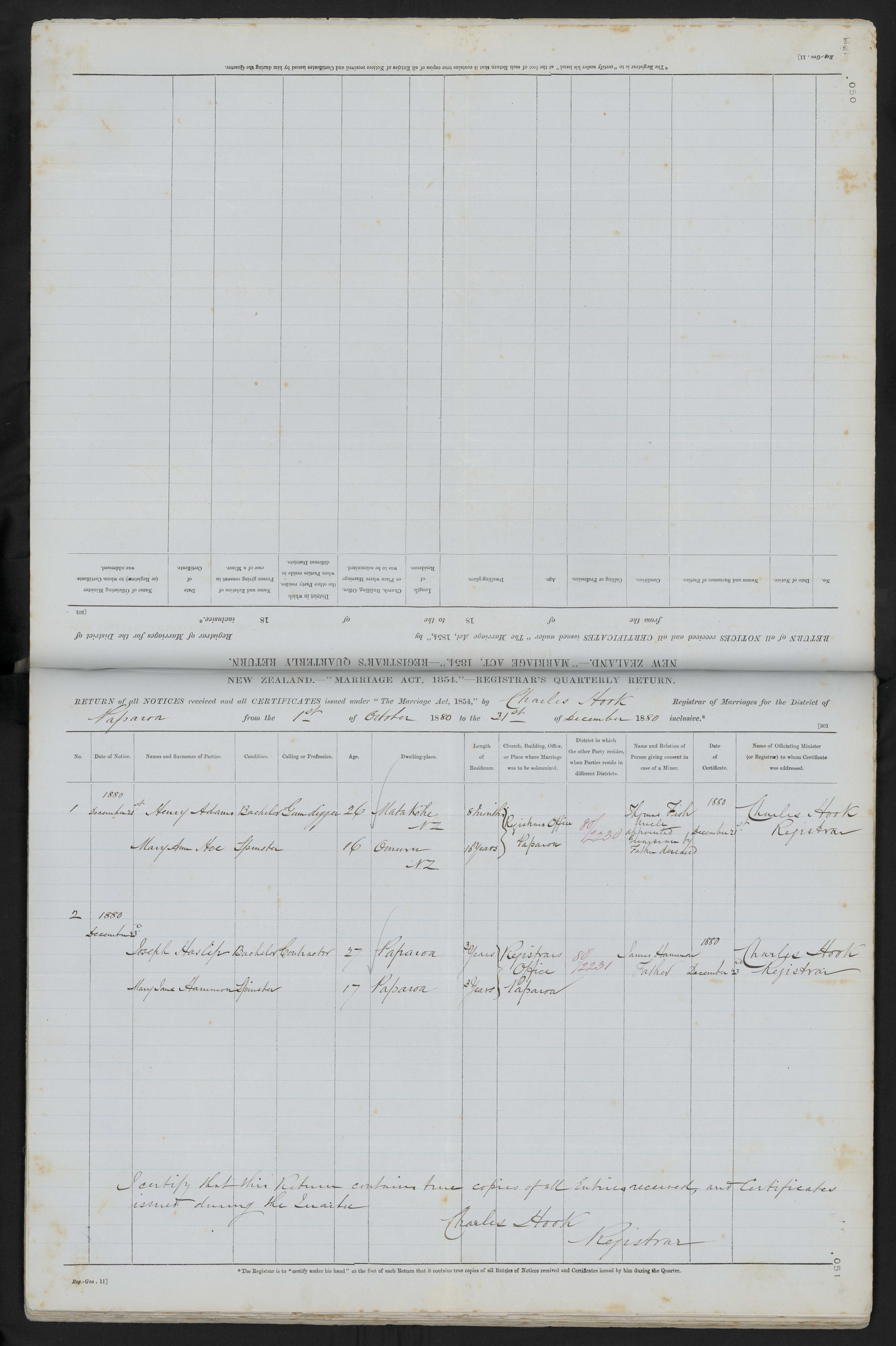 Registrars Office Paparoa 80/1230 Thomas Hoe father 21 December 1880 Charles Hook Registrar