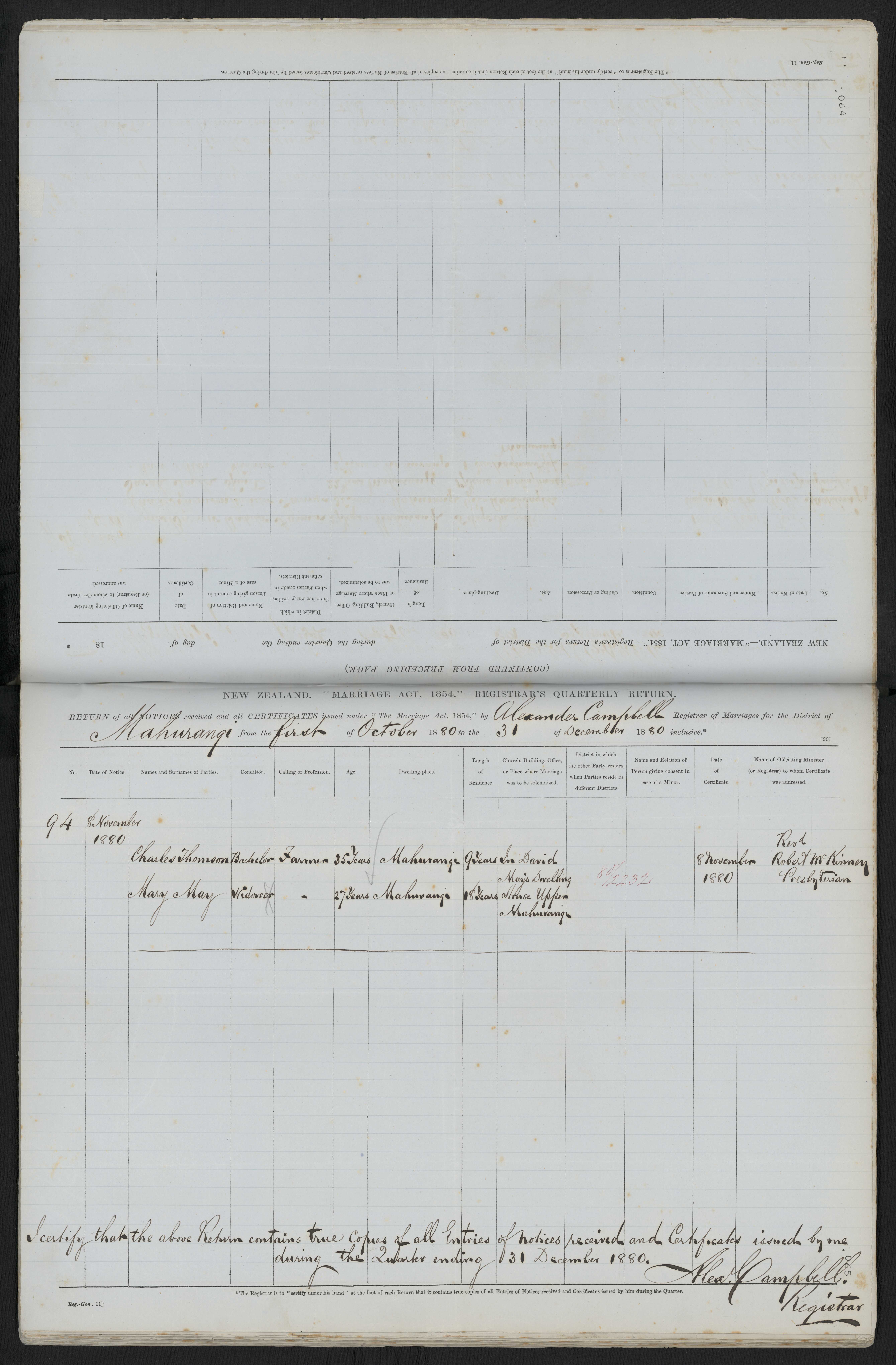 In David May's Dwelling House Upper Mahurangi 80/12232 8 November 1880 Revd Robert McKinney Presbyterian