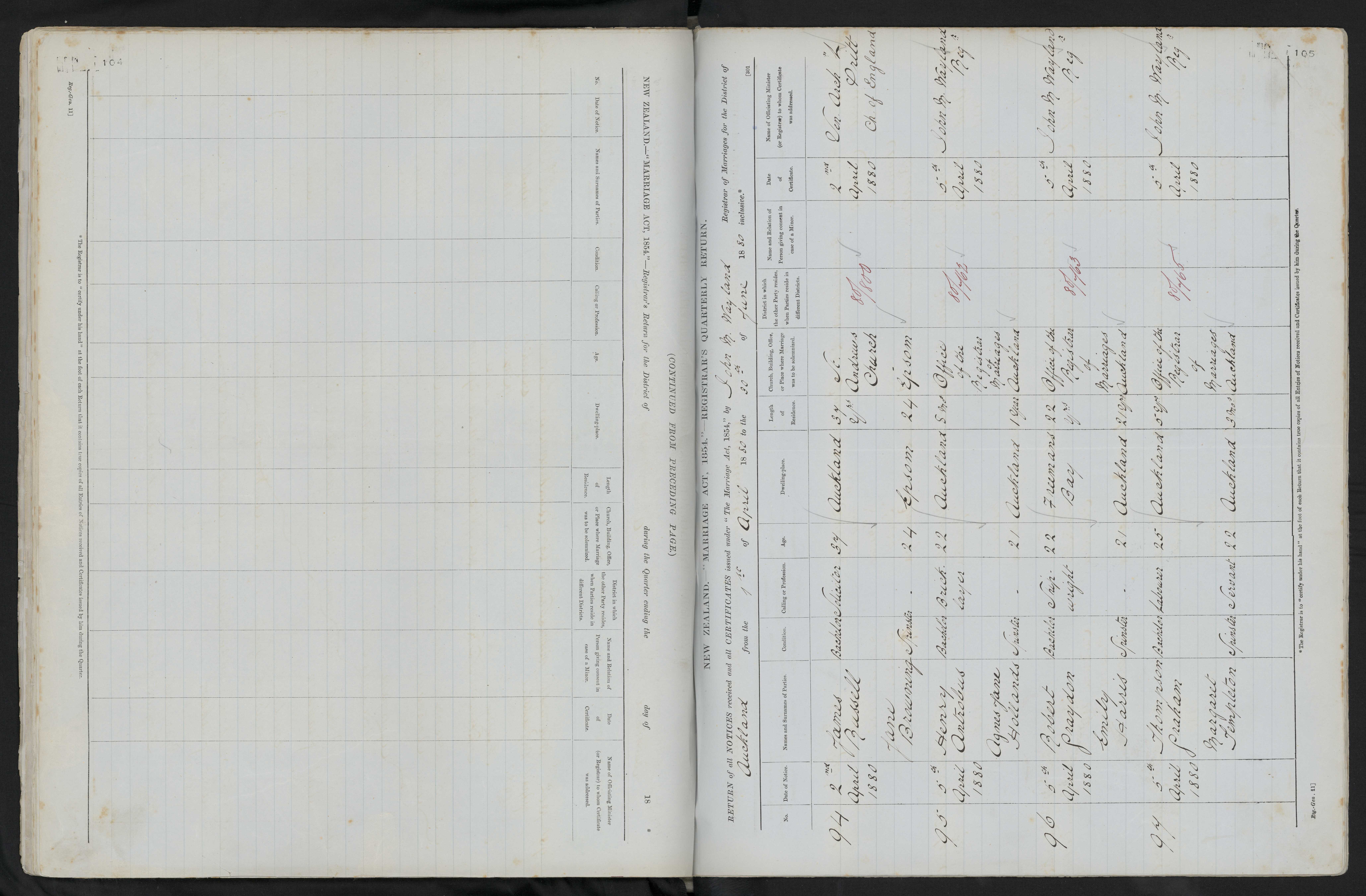 Office of the Registrar of Marriages Auckland 80/465 5 April 1880 John M. Wayland Reg