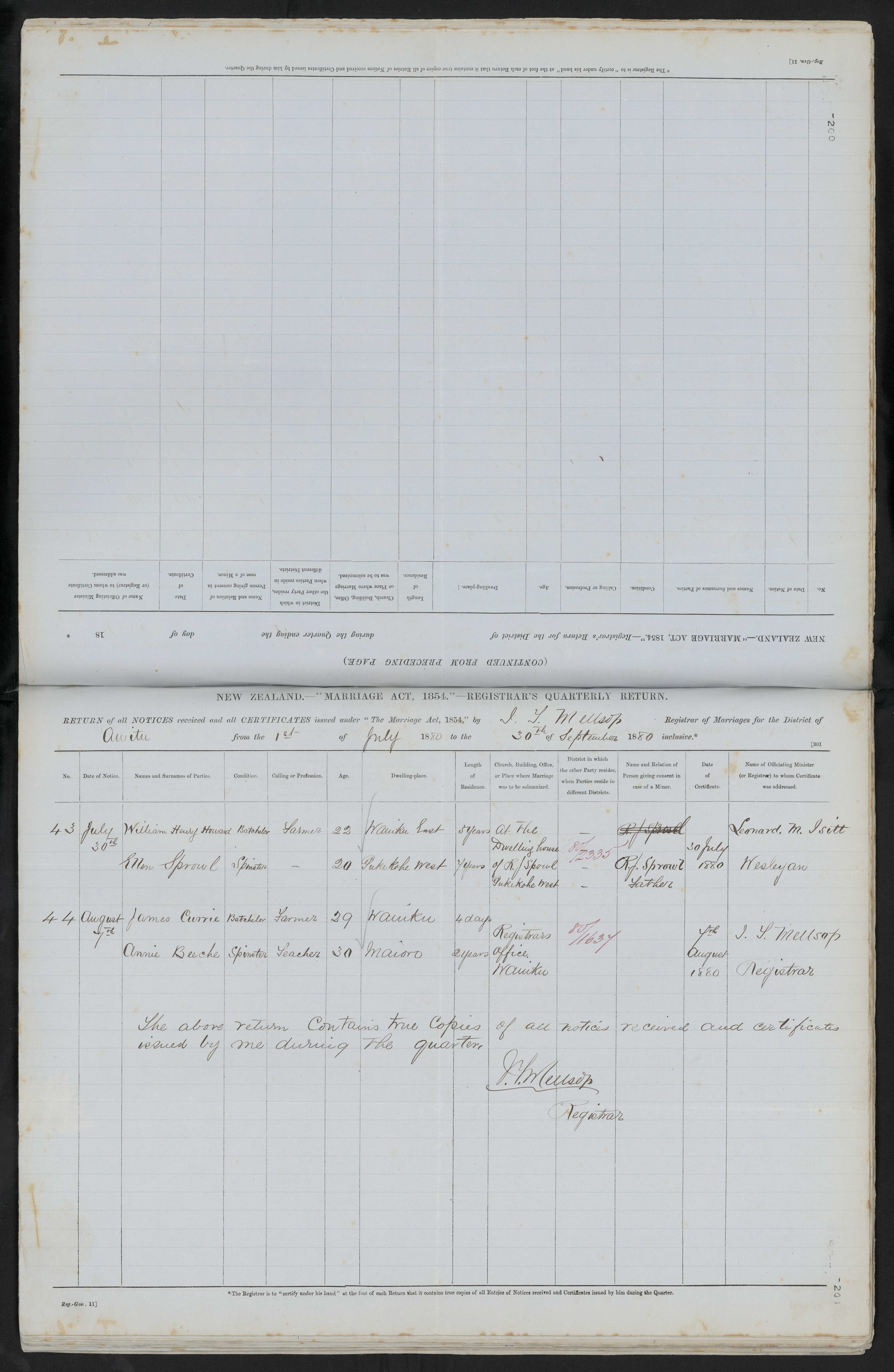 Registrars office, Waiuku 80/63 7th August 1880 J. F. Millsop Registrar