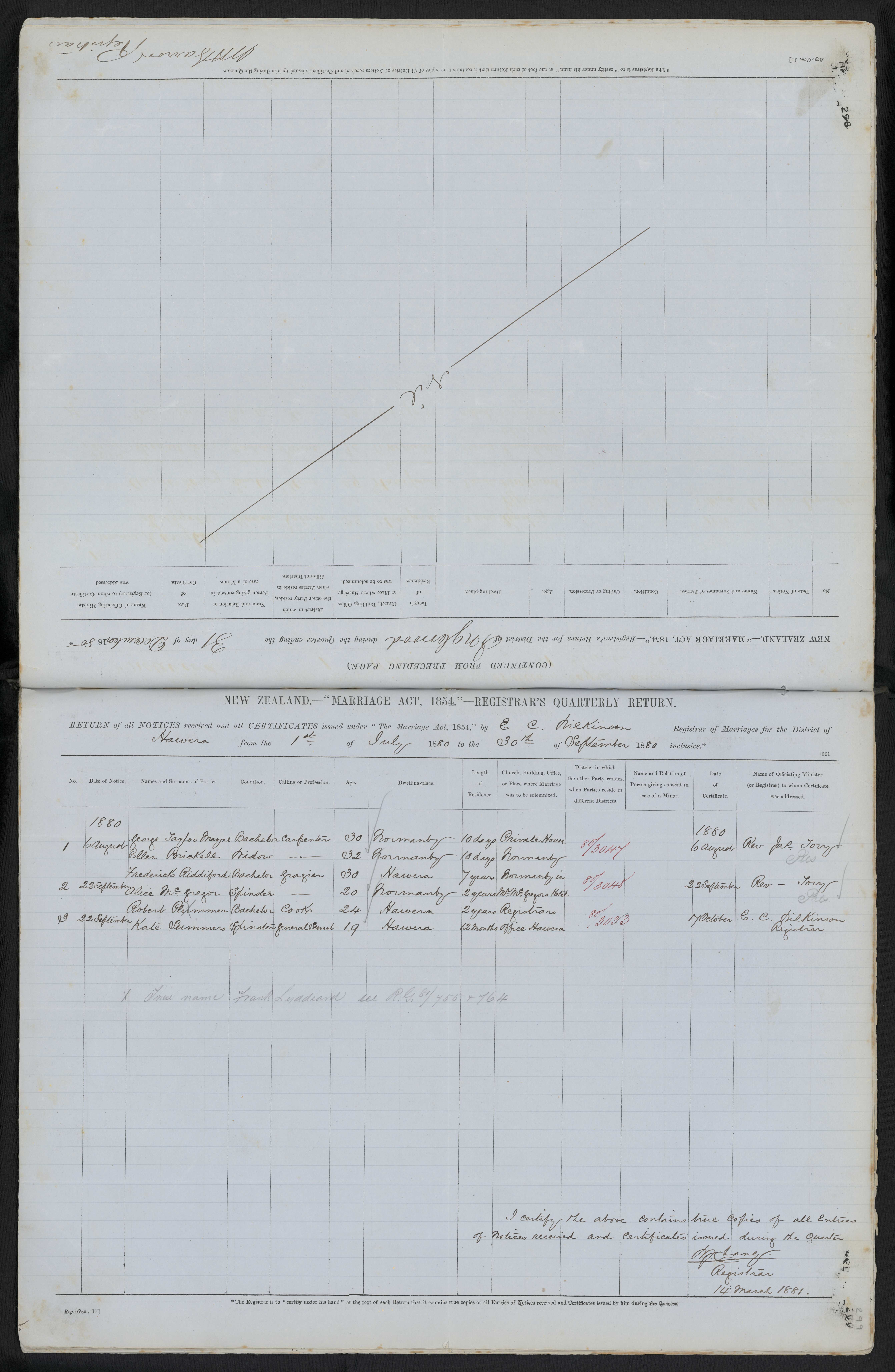 Registrars Office Hawera 80/3053 1 October 1880 E. C. Dickinson Registrar