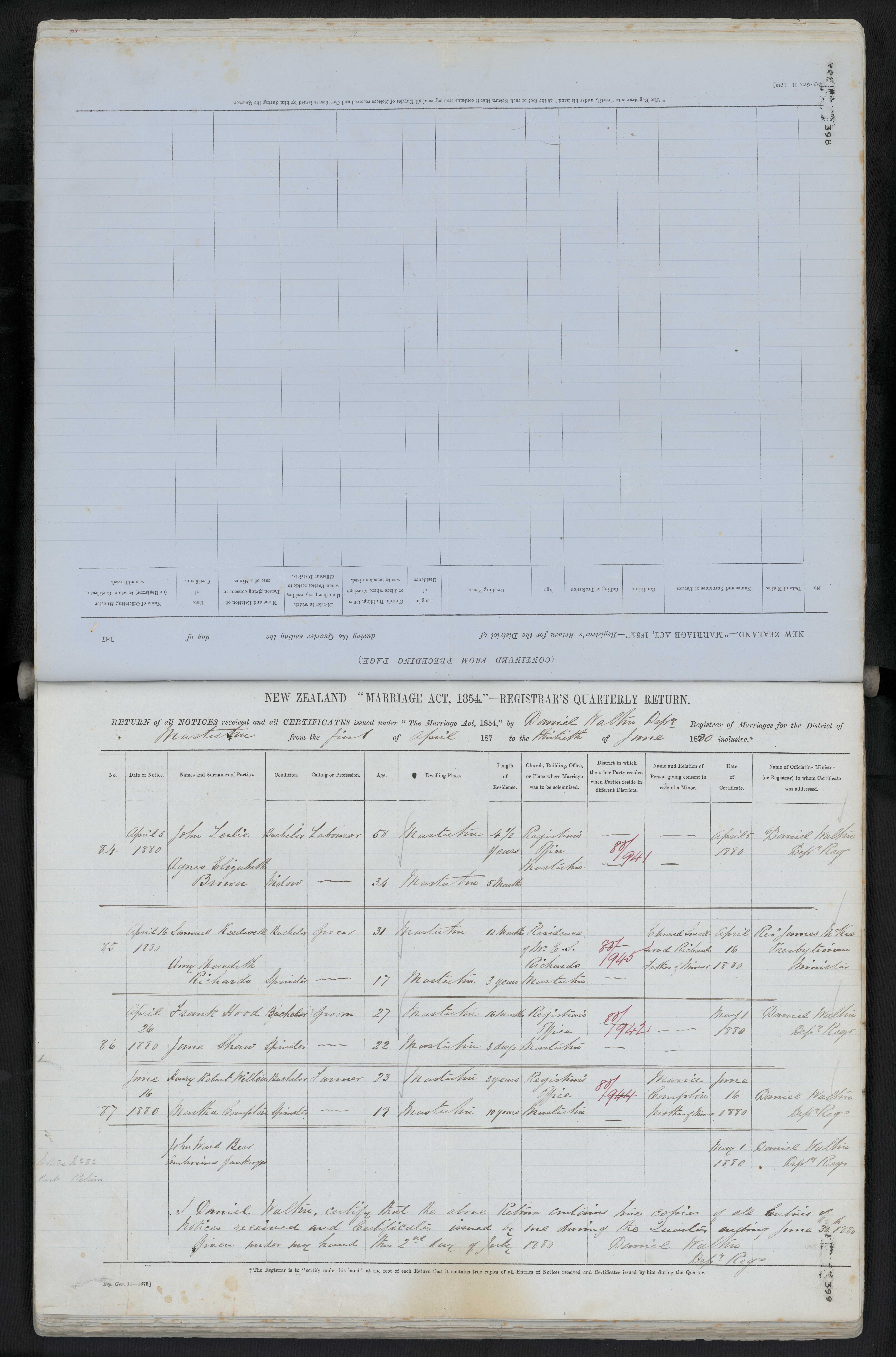 Registrar's Office Masterton 80/941 5 April 1880 Daniel Walmsley Depy Regr