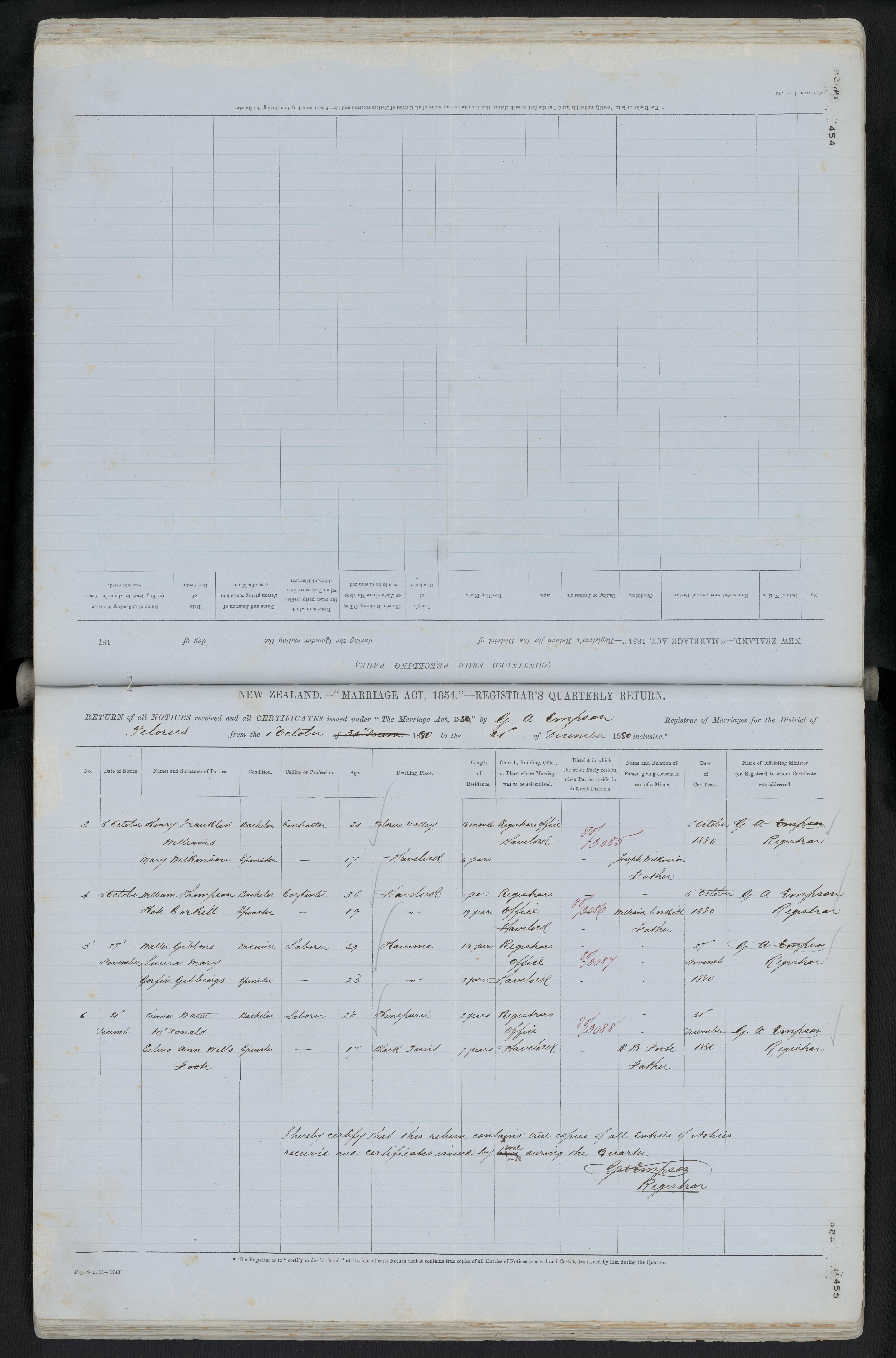 Registrars Office, Havelock 80/3087 27 November 1880 G. A. Empson Registrar