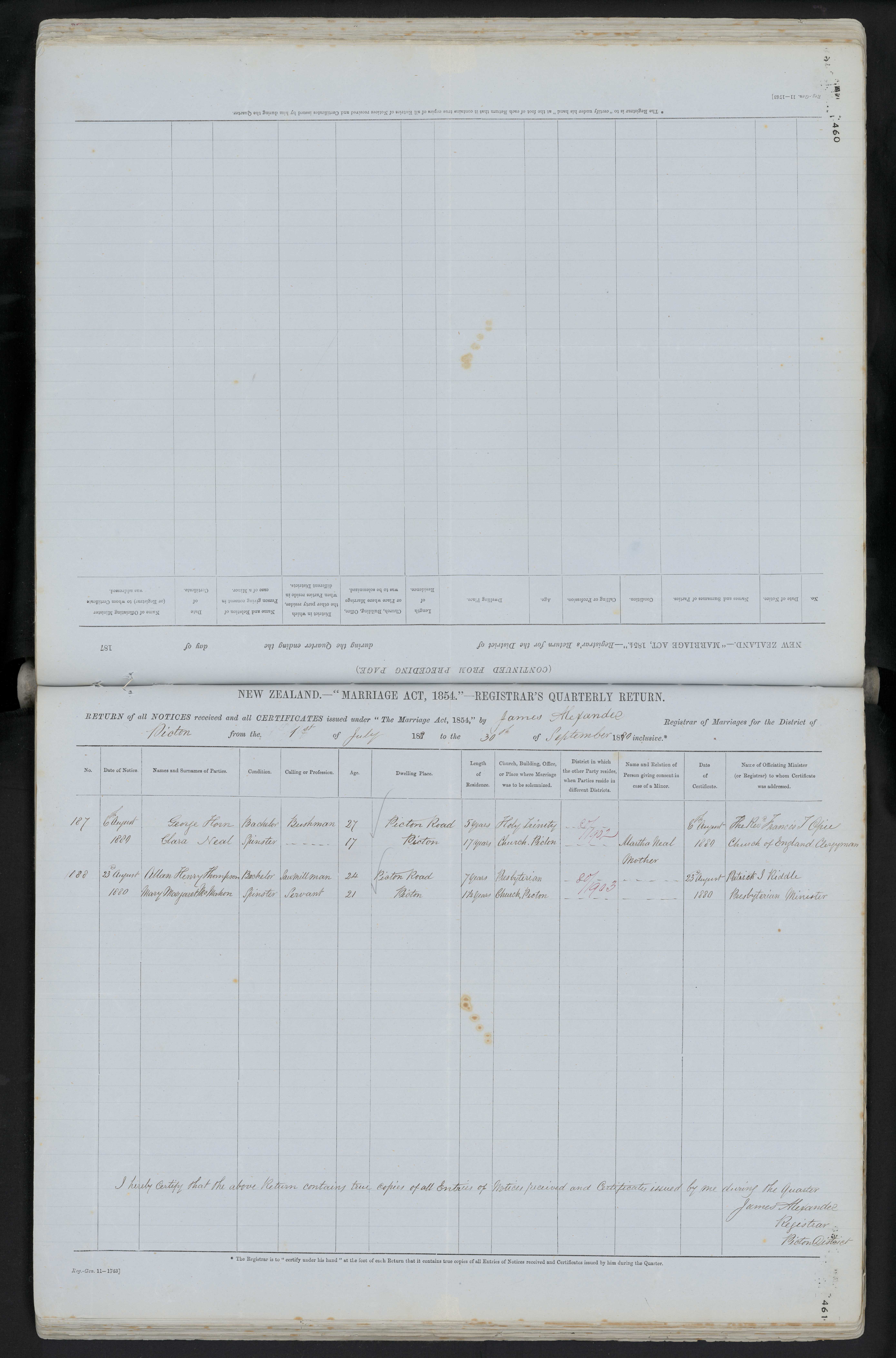 District of Picton Quarter ending 30 September 1880 Registrar James Alexander