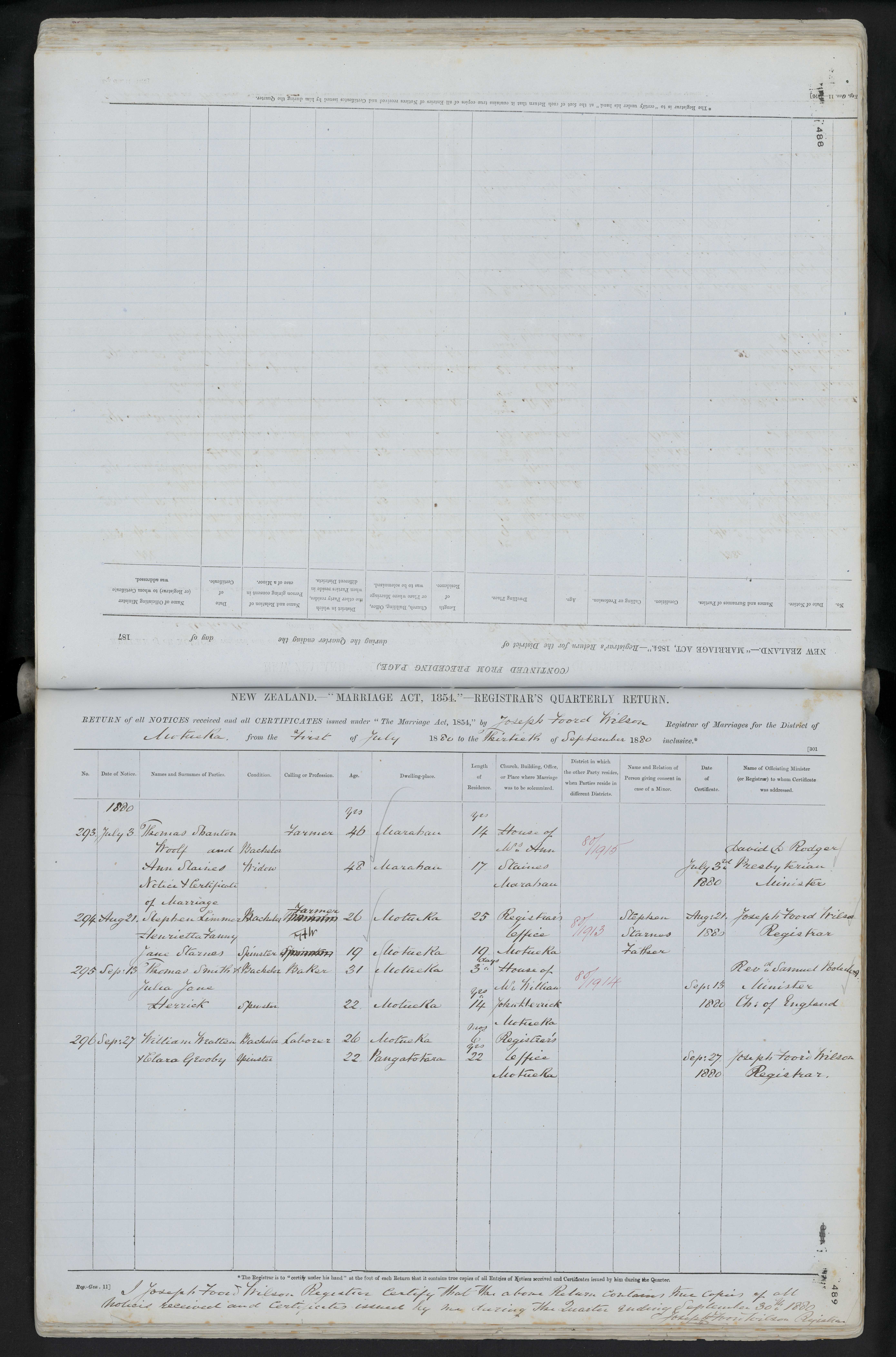 Registrar's Office Motueka 27 September 1880 Joseph Foord Wilson Registrar