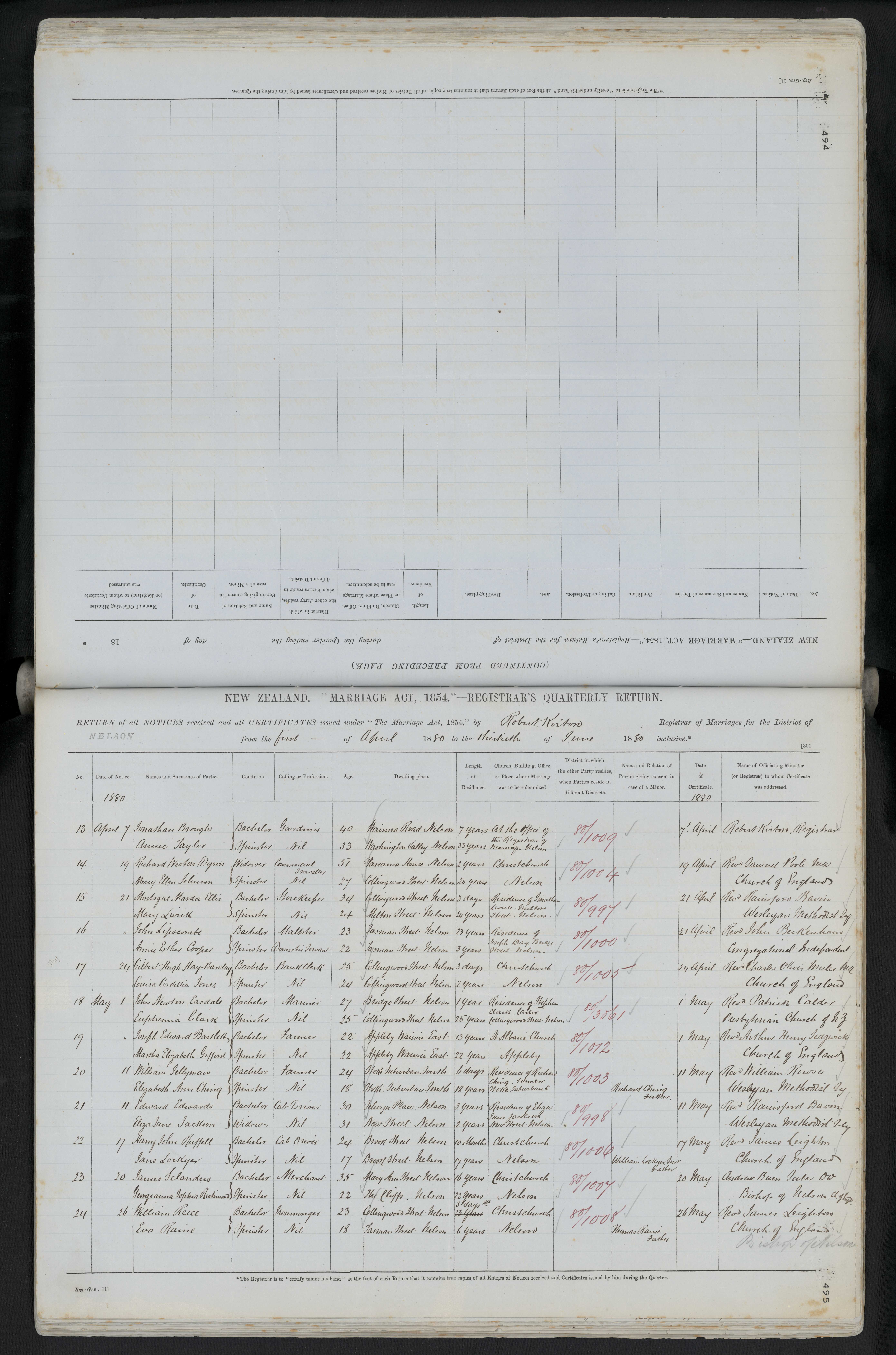 At the Office of the Registrar of Marriages, Nelson | 80/1009 | 7 April 1880 | Robert Kirton, Registrar | ||||||||||||||||||||||||||||||||||||||||||||||||||