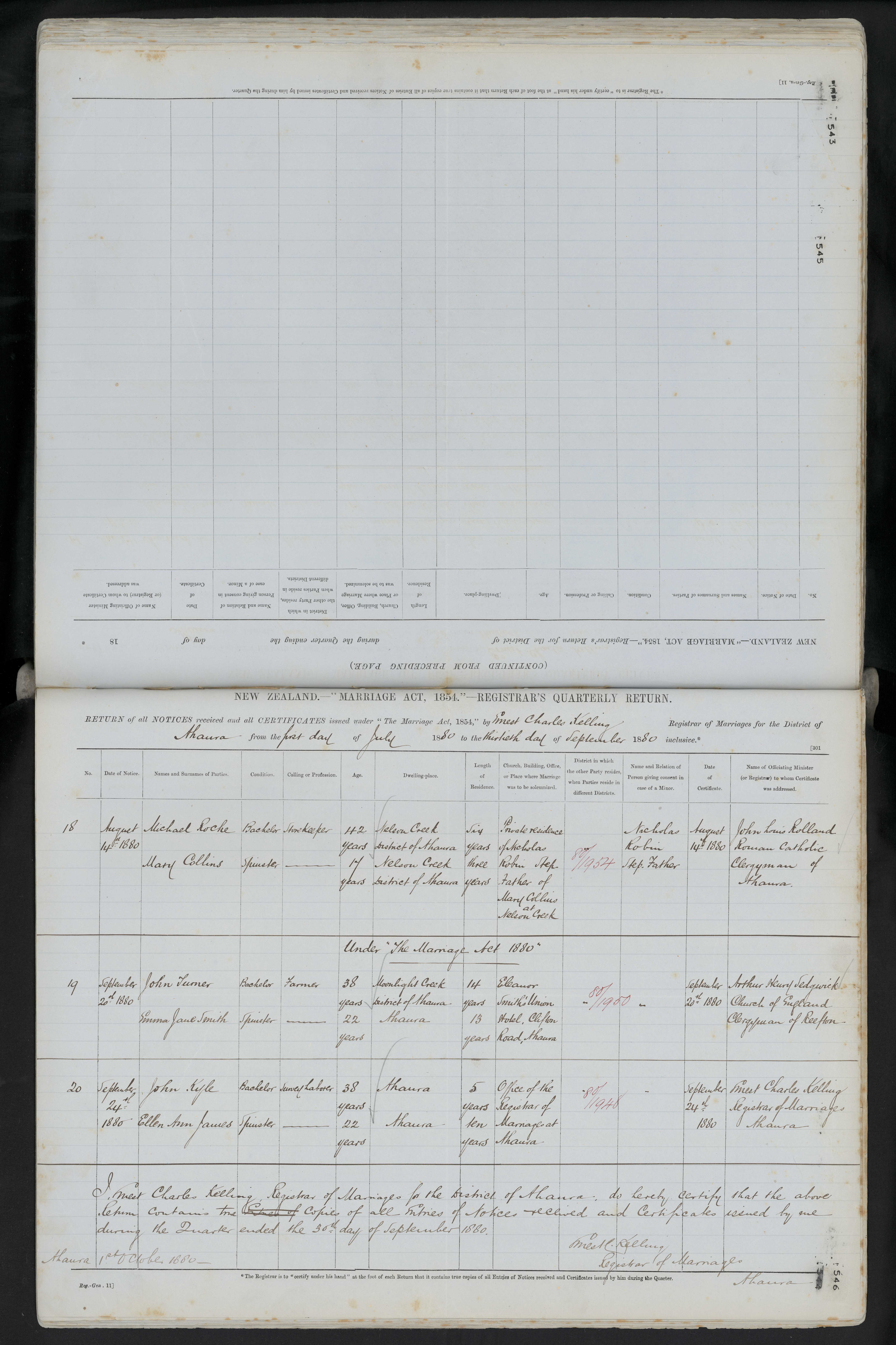 Office of the Registrar of Marriages at Ahaura 80/1948 24th September 1880 Ernest Charles Kelling Registrar of Marriages Ahaura