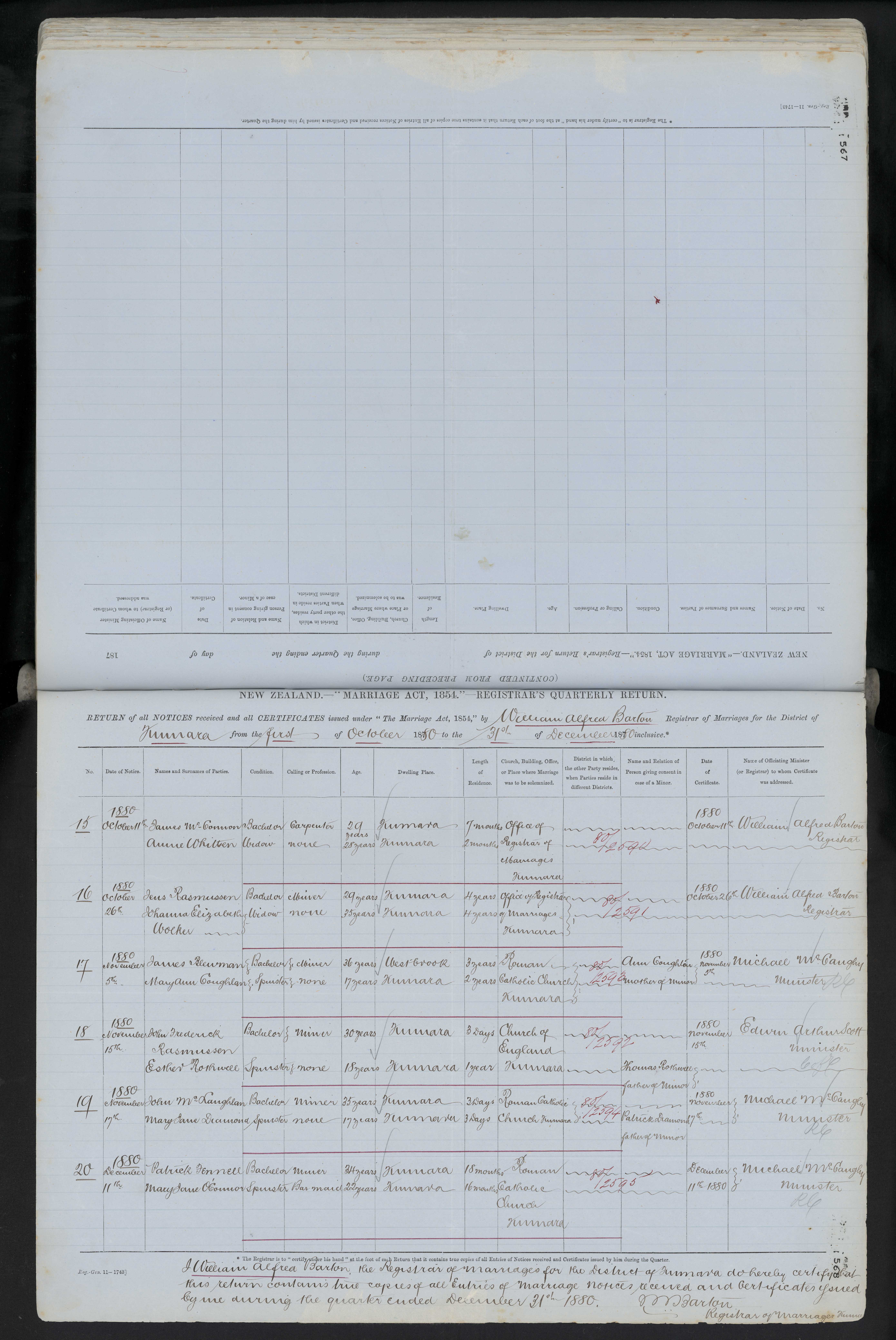 Office of Registrar of Marriages Kumara | 12591 | 11 October 1880 | William Alfred Barlow Registrar | ||||||||||||||||||||||||||||||||||||||||||||||||||