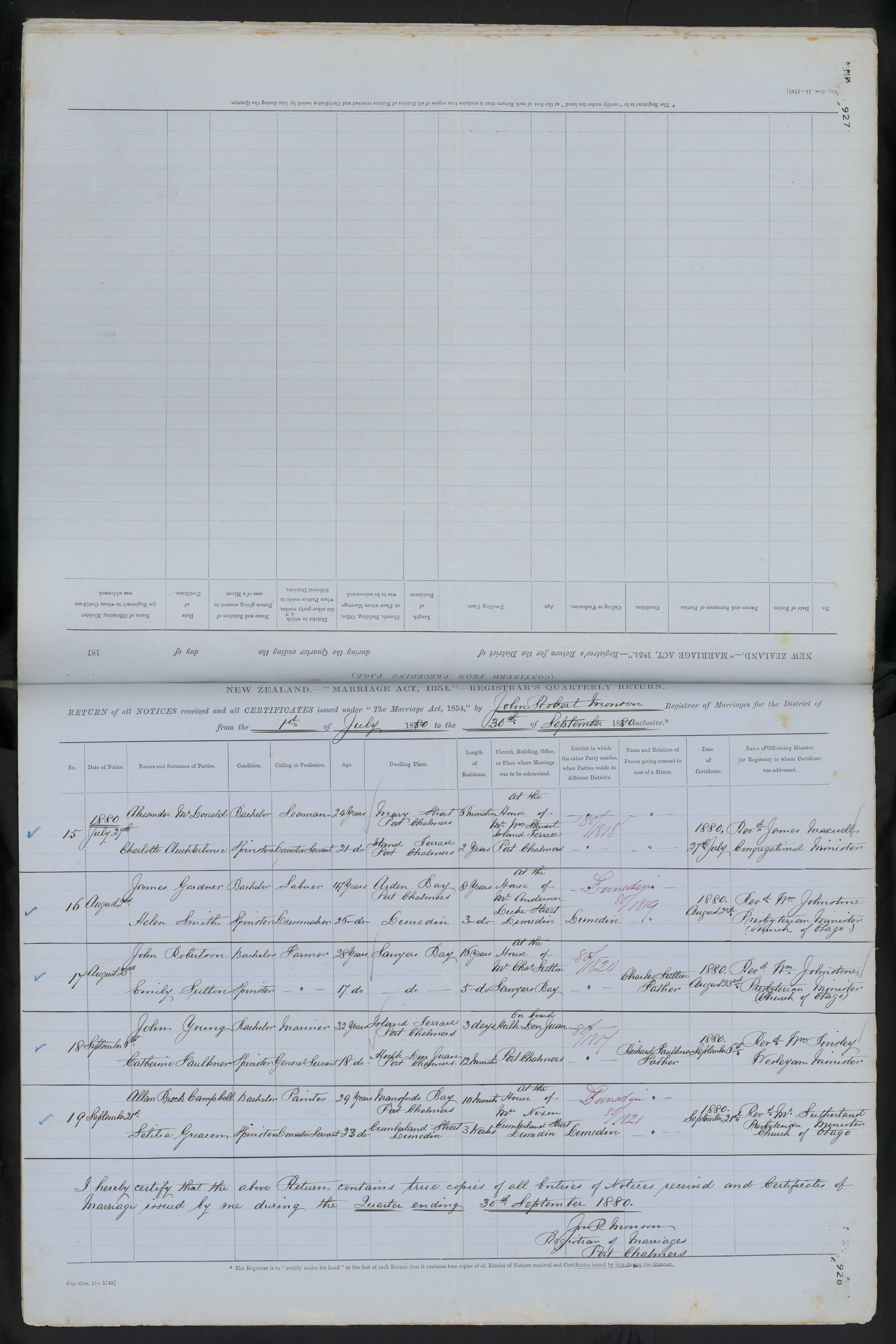 House of Mr Anderson Dunedin | 824/1849 | 18 August 1880 | Rev Wm Johnstone Presbyterian minister (Church of Otago) | ||||||||||||||||||||||||||||||||||||||||||||||||||