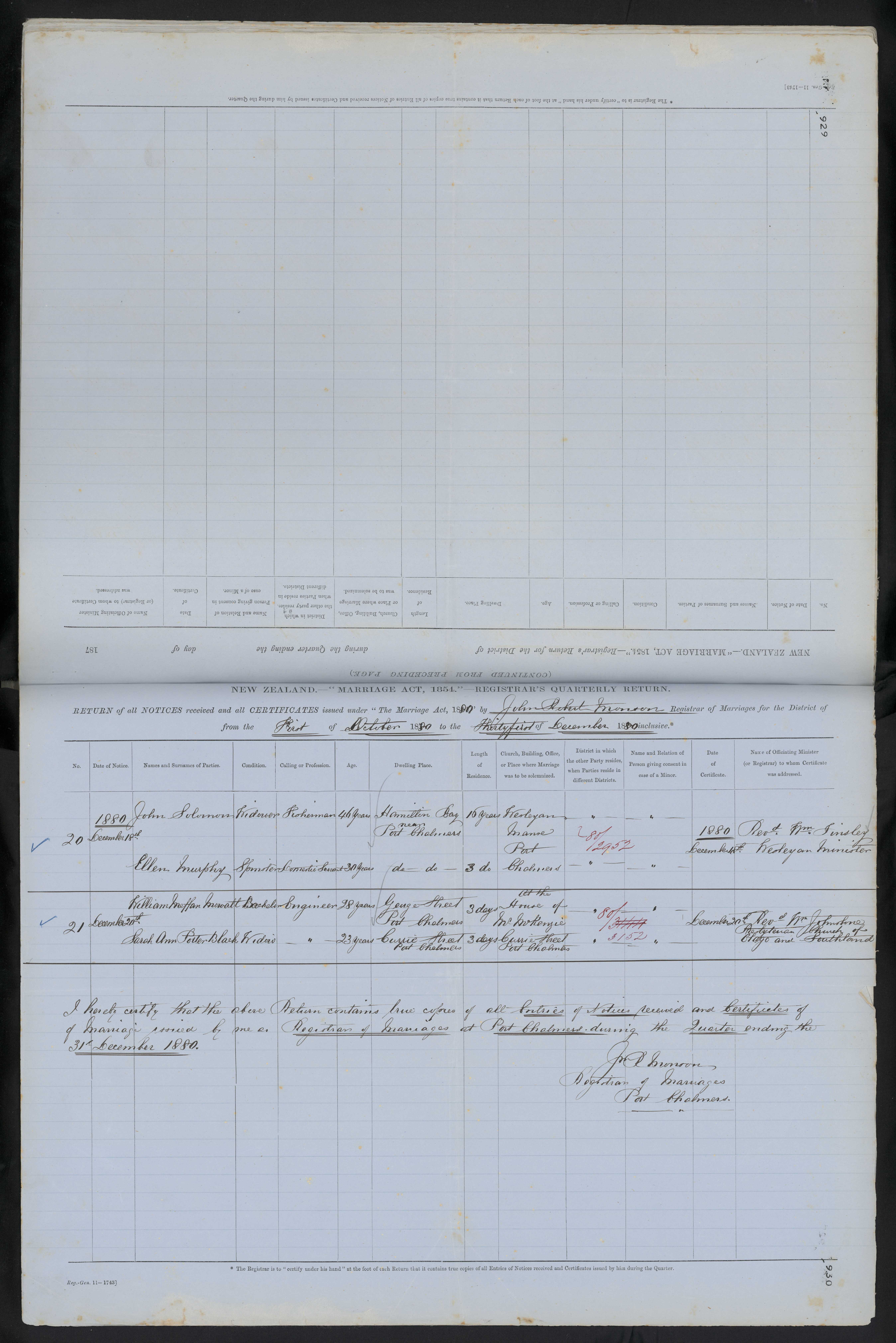 Wesleyan Manse Port Chalmers 12952 7 December 1880 Rev. Wm. Insley Wesleyan Minister